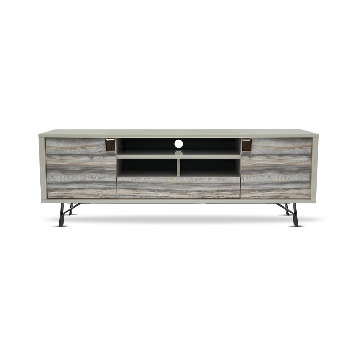 Key features of this TV base include a sturdy metal construction with a high gloss EcoStone finish in a dark grey. With dimensions of 178.4 cm length, 42.1 cm depth, and 61.7 cm height, it provides ample space for your television and other media accessories. The MDF material used ensures durability and stability.