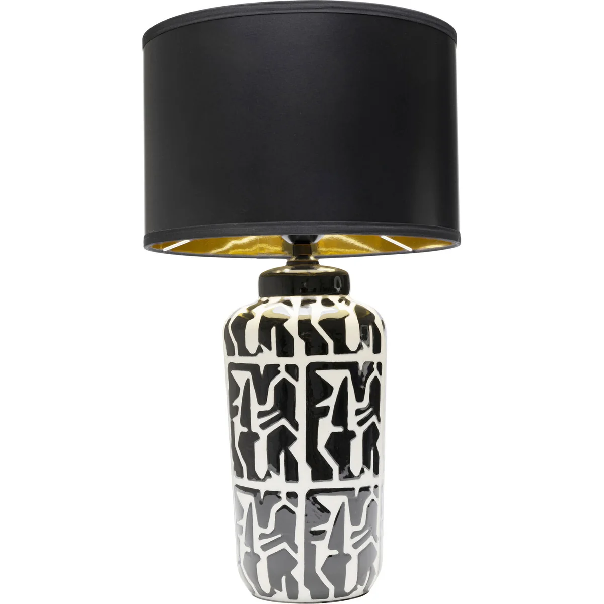 Impressively designed with a sculptural base, this table lamp stands at 62 cm. With dimensions of 36 cm by 36 cm, it features a black and white artistic pattern. The lampshade, made of 100% polyester, has a shiny gold interior that casts a warm, tender glow.