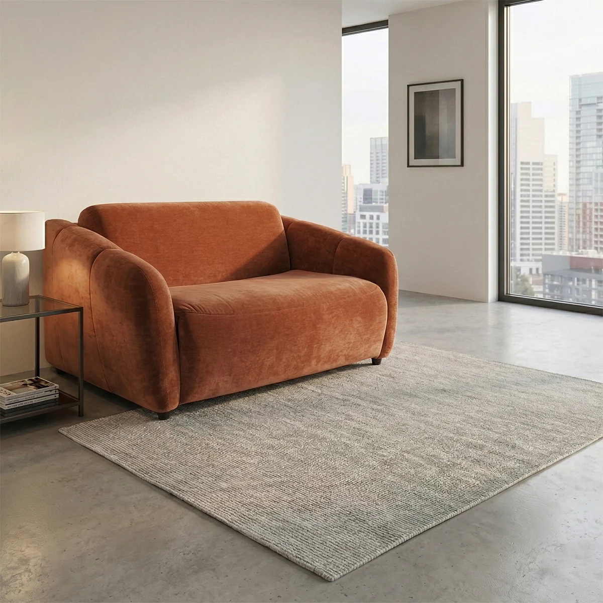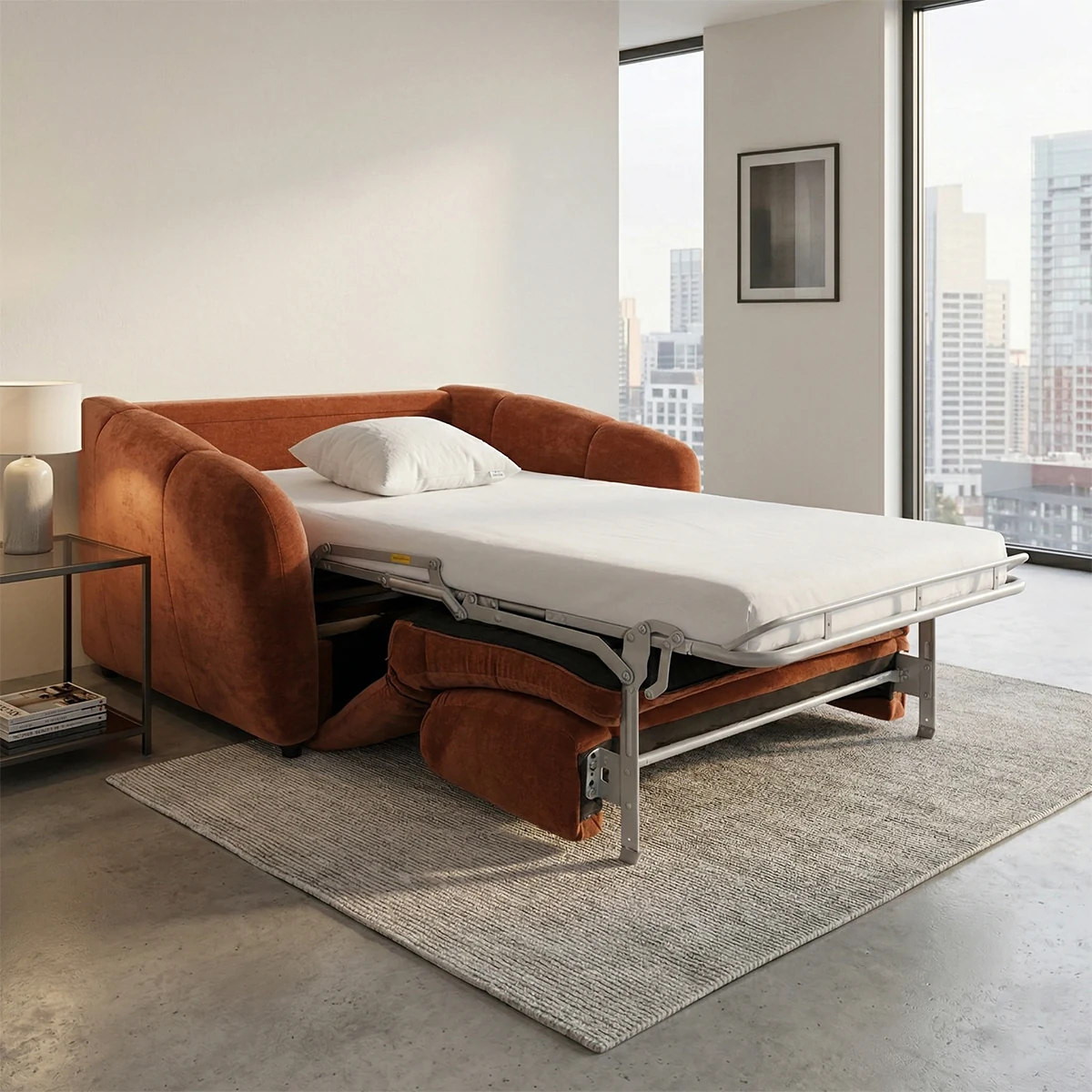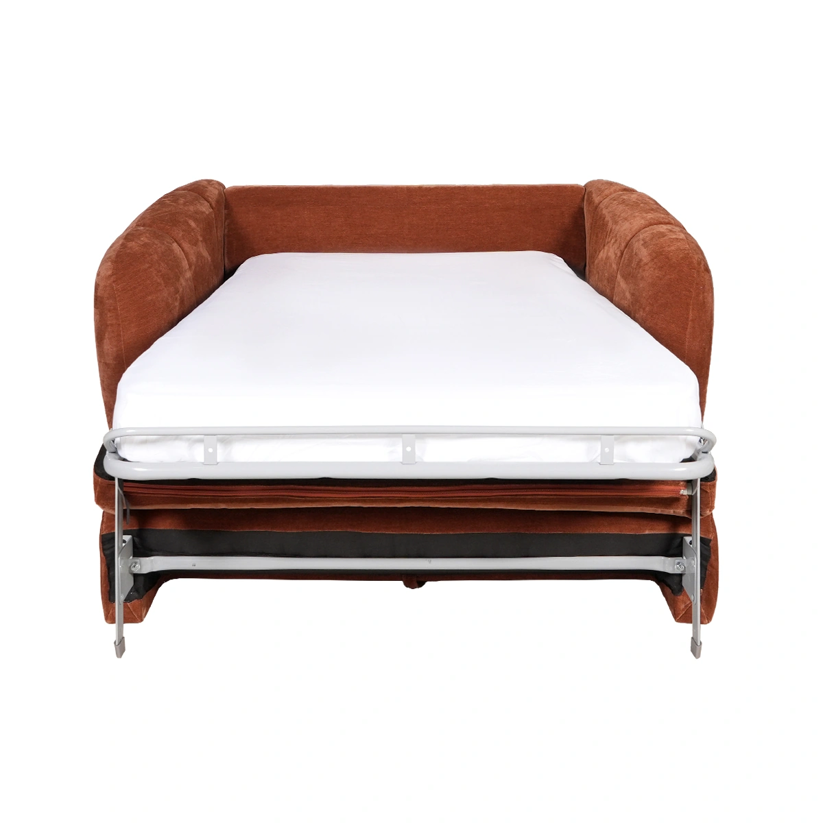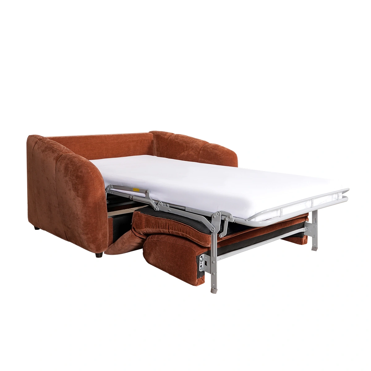 The Kivo 1.5 Seater Armchair Bed in rust is a compact convertible seating solution designed for multifunctional living spaces. This armchair bed combines modern design with everyday practicality, making it ideal for apartments, guest rooms, or flexible living areas. Upholstered in 100% polyester fabric, the armchair features foam cushioning and a laminated veneer lumber frame for stability. Its convertible mechanism allows it to transform easily from a comfortable armchair into a sleeper bed, supported by durable plastic legs. This armchair bed offers convenient space-saving functionality. It provides comfortable seating by day and a practical sleeping solution by night, making it a smart choice for modern, compact homes.
