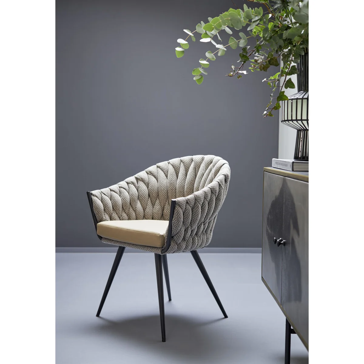 Introducing the Knot Dining Chair with Armrest, a blend of comfort and modern design. Upholstered in elegant tweed grey fabric, this chair combines luxurious seating with stylish armrests, making it the perfect addition to any contemporary dining space.