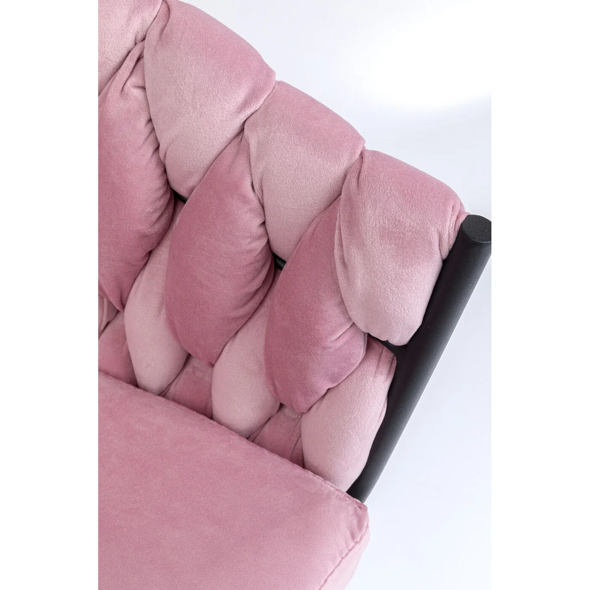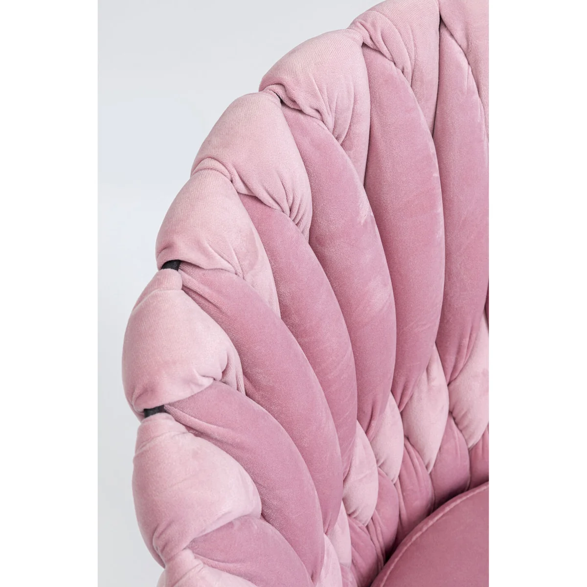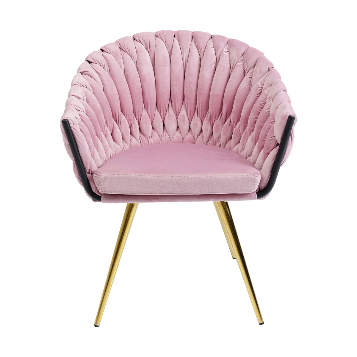 ● An extraordinary gem in rose and velvet: ultra-comfortable armchair, extra stylish with a wickerwork backrest ● This fancy velvet chair looks particularly stylish in combination with marble, brass or black ● Thanks to the continuous arm and backrest you can also sit comfortably on this chair on long evenings around the dining table ● Modern upholstered chair with design borrowings from the trendy Fifties style ● The voluminous upholstery and legs in the colour brass bring a dash of glamour into the room