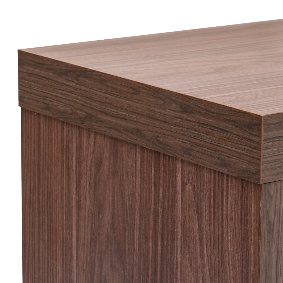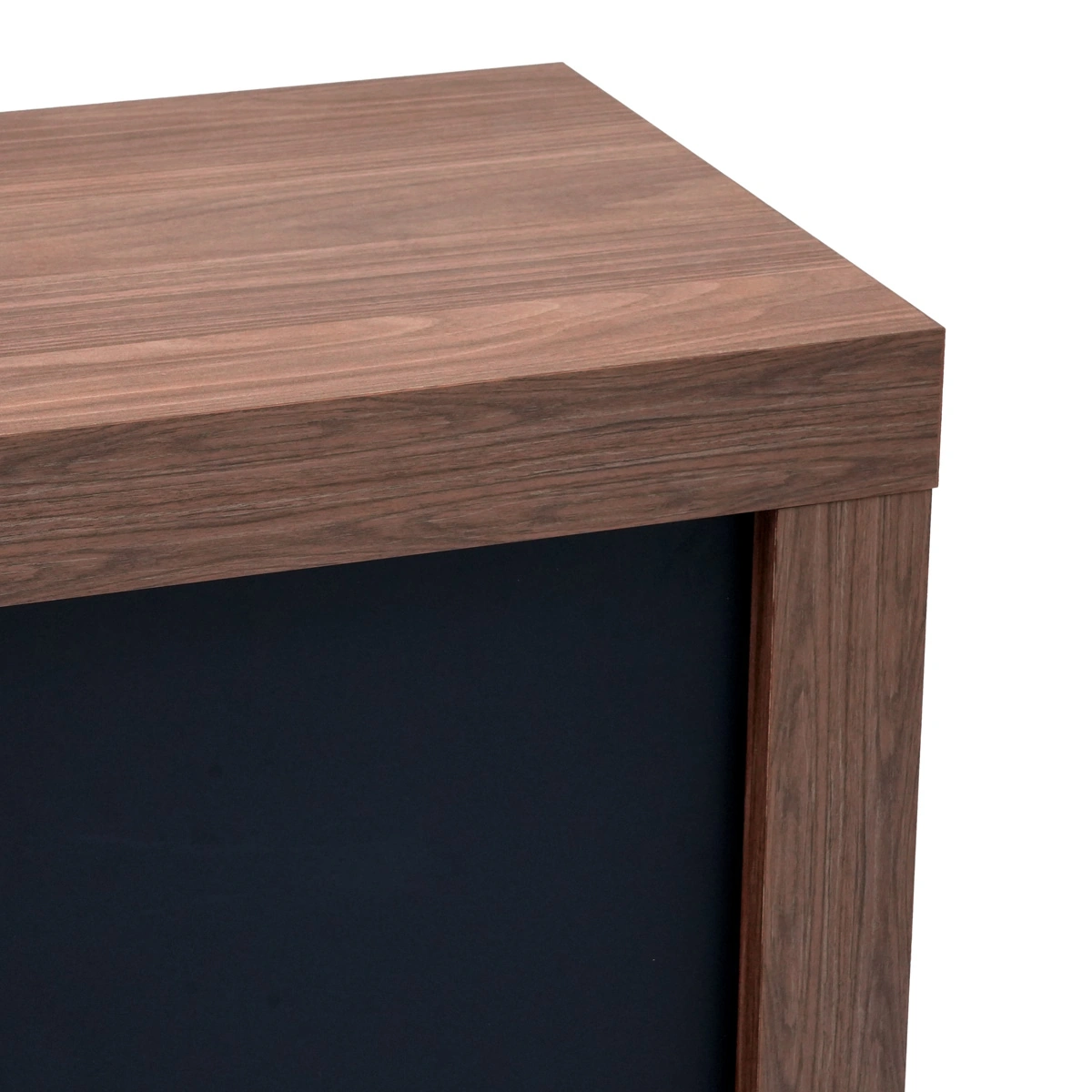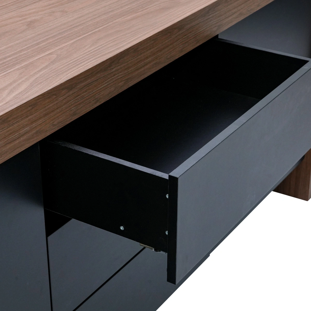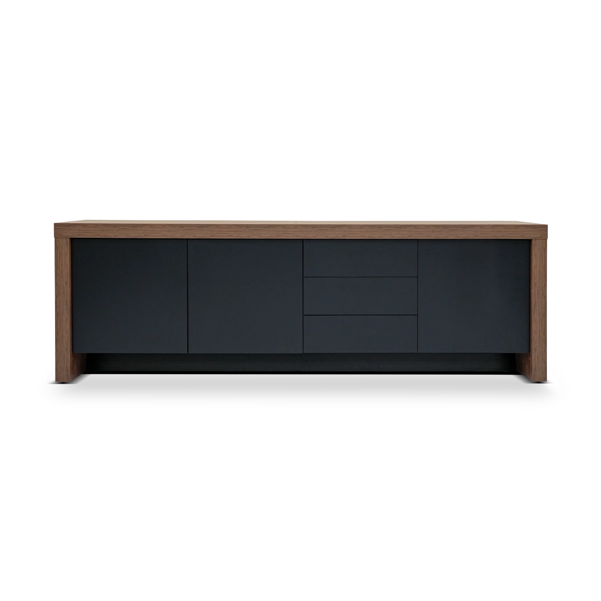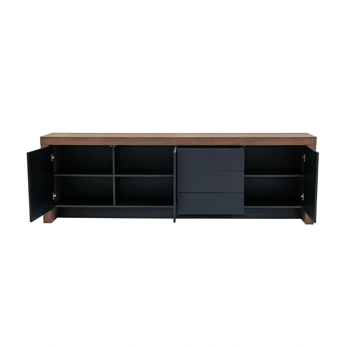 Kobe Sideboard in Walnut Melamine and Black combines a warm walnut melamine finish with sleek black details, creating a modern yet timeless look. It features three doors and three drawers for ample storage, keeping your space organized and clutter-free. Its streamlined design makes it a stylish addition to both dining and living areas.