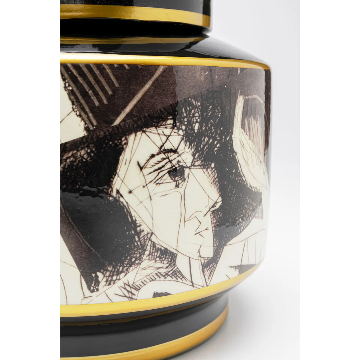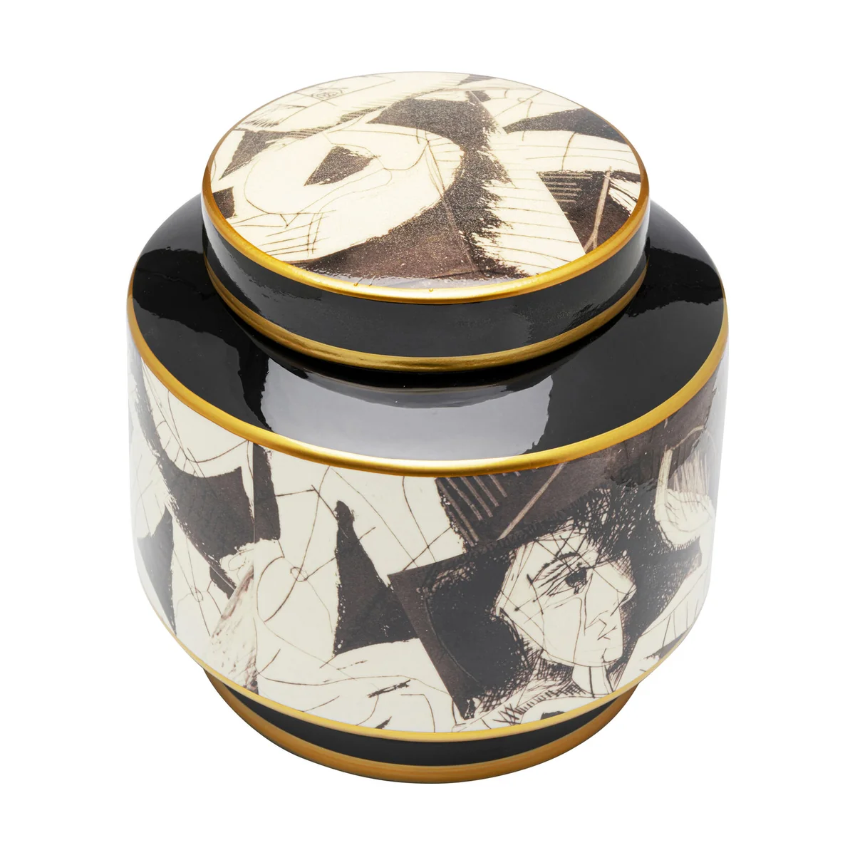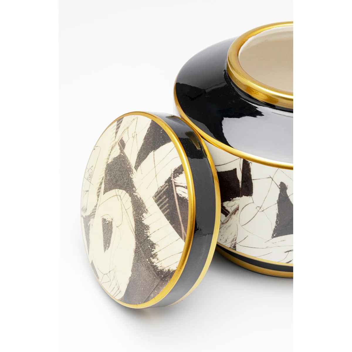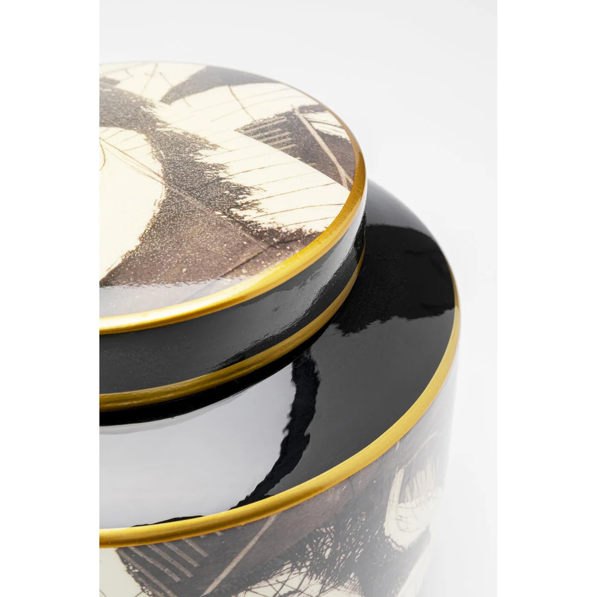 The La Spezia Deco Jar in multicolored porcelain is a stunning blend of artistry and functionality. Its artistic pattern in black, white, and lustrous gold details add an air of luxury to any space.