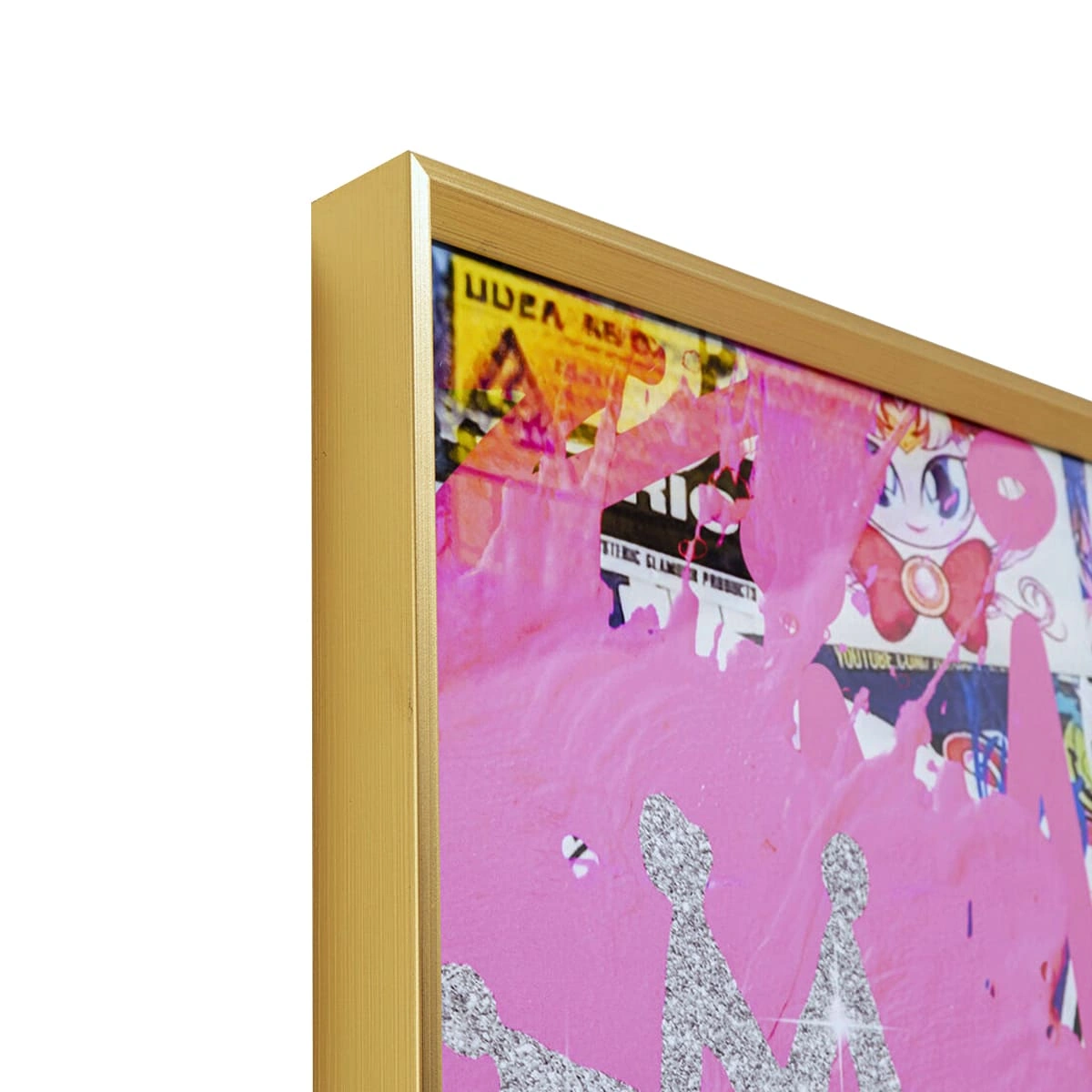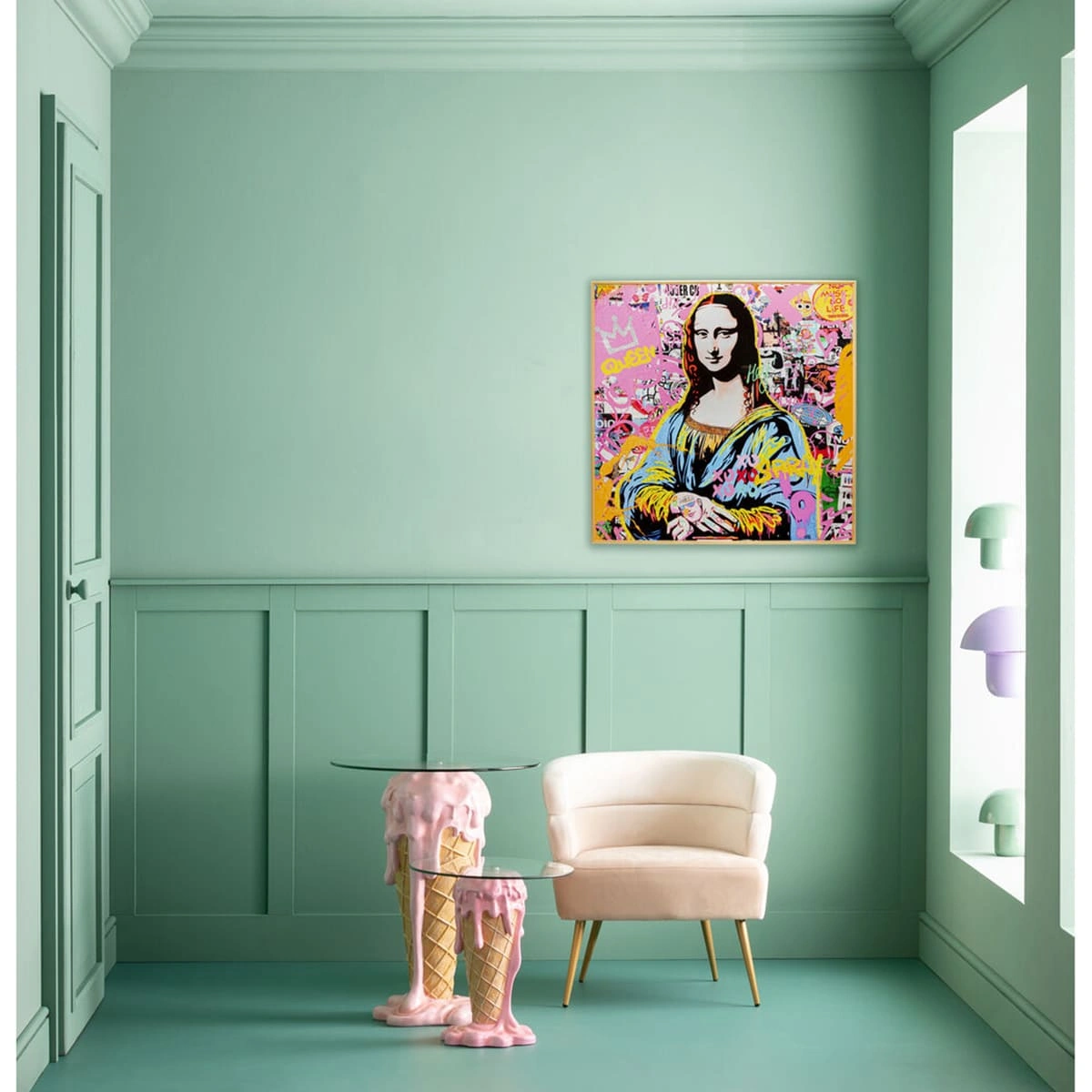 Key features include a vibrant rendition of the iconic Mona Lisa in graffiti style, a size of 100 x 100 x 4 cm, and glittering rhinestone applications that add a glamorous finish. The slim gold frame is crafted from polystyrene while the mural is printed on art paper and covered with toughened safety glass for durability.