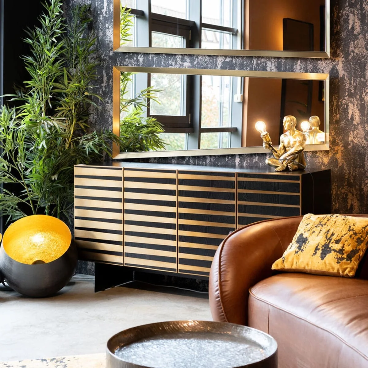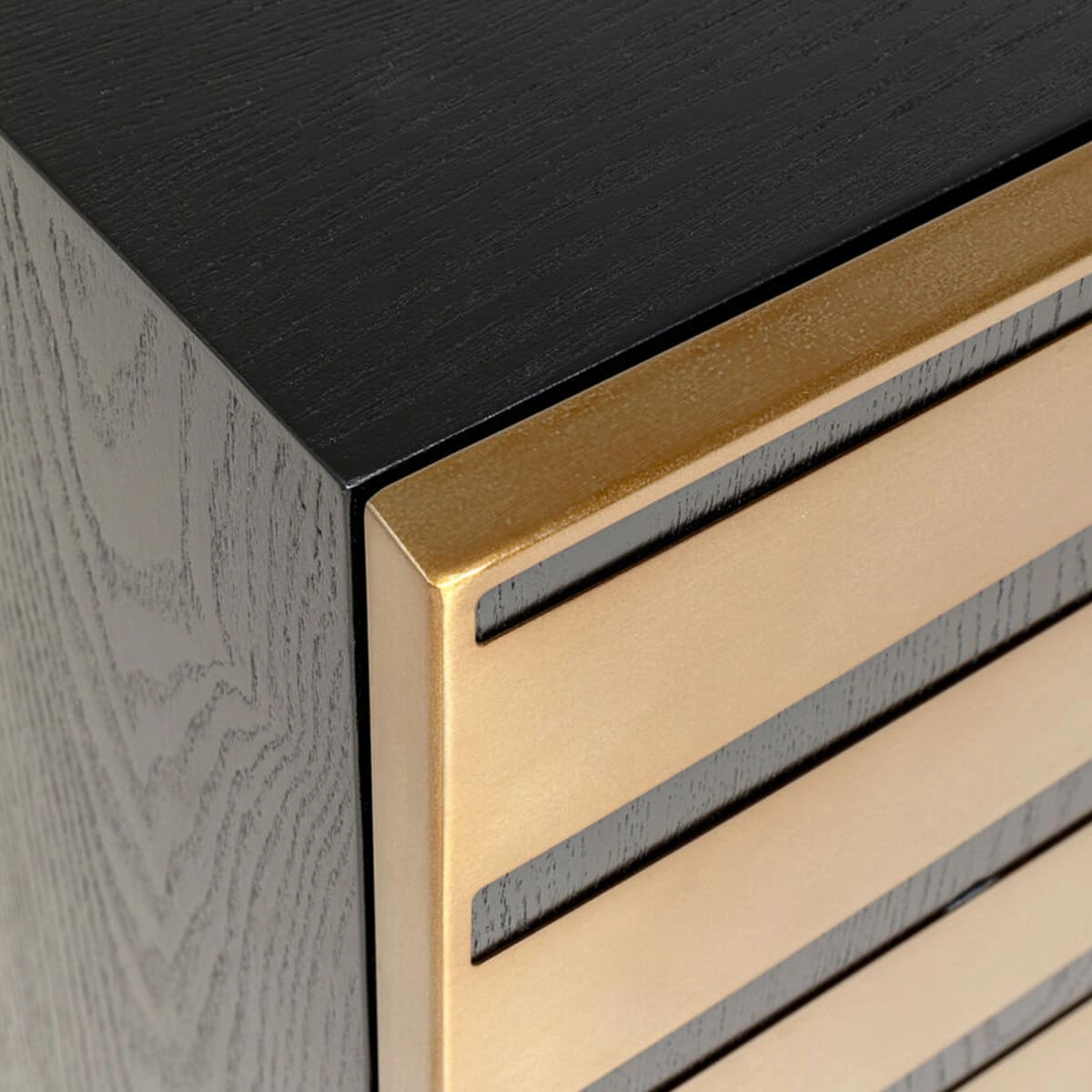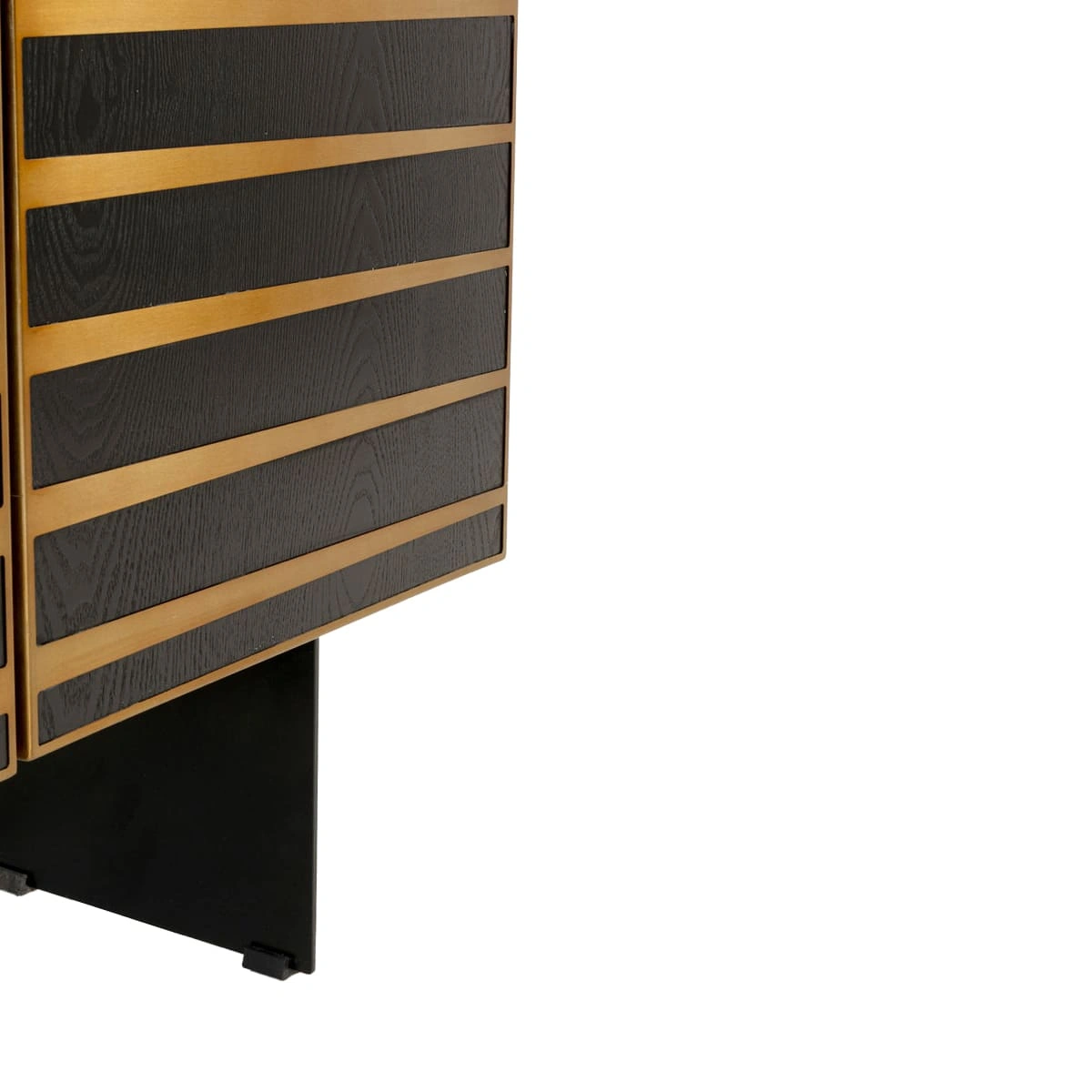 This sideboard masterfully combines modern design with excellent craftsmanship. The elegant body made of deep black wood is interspersed with bronze stainless steel strips, giving it a luxurious look. Whether in the living room, hallway, or dining area, the sideboard not only offers generous storage space but also adds stylish accents. The harmonious combination of fine materials and clean lines makes it an eye-catcher in any room. Combined with minimalist furniture or as a contrast to vibrant colors, it always looks elegant and understated. A real highlight that impresses both functionally and aesthetically, enriching rooms with clean lines and refined charm.
