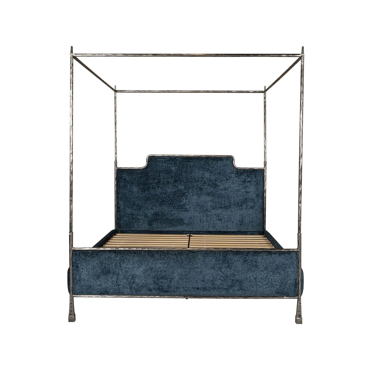 Key features of this bed include a soft Bouclé Fabric headboard, a reflective chrome frame, and a mattress size of 180x200 cm. It's carefully constructed with a Plywood support base and cushioned with PU Foam and Polyfiber for an unmatched level of comfort. The chrome finish is achieved through MS Hand-Forged process, adding to its contemporary elegance.