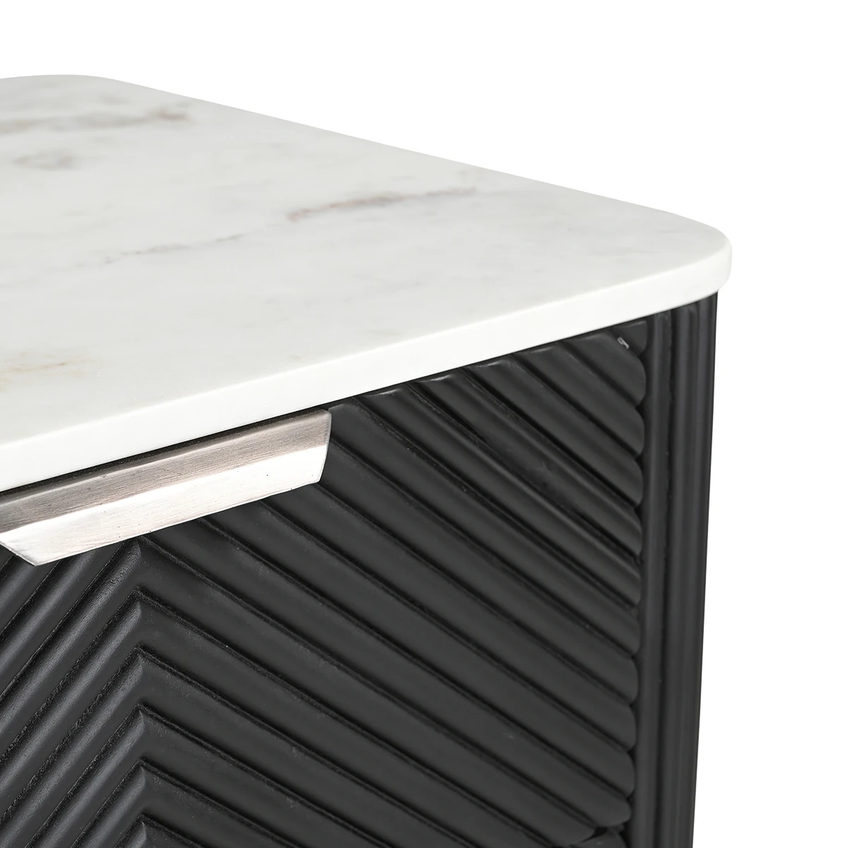 Built with a hand-forged chrome metal frame, the table features a natural marble top supported by a mango wood base. The combination of stone and wood adds visual contrast, while the compact proportions make it ideal as a nightstand or side table.