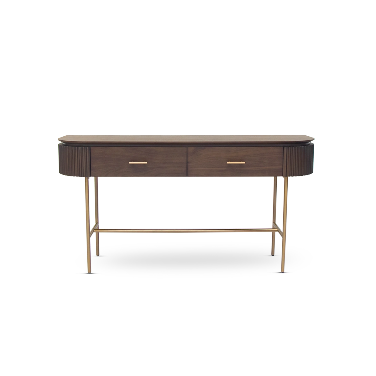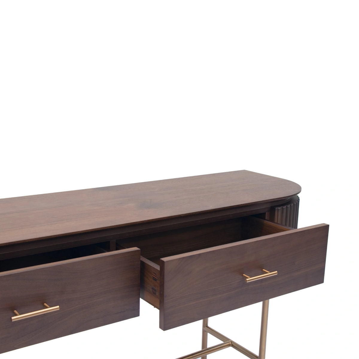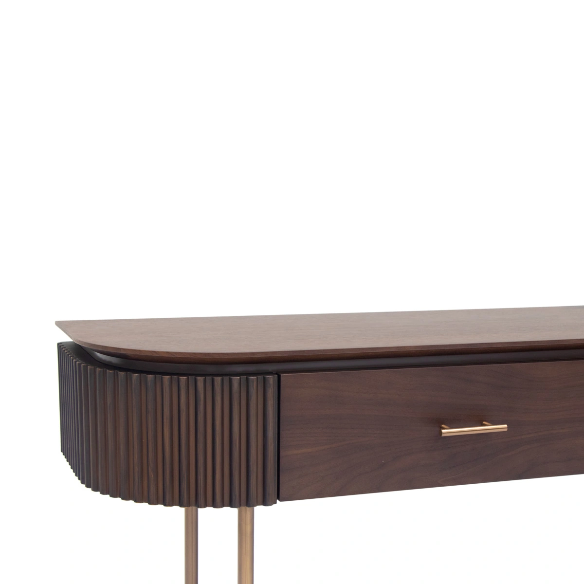 Introducing the Lantine Console Table in Walnut Veneer with Brass accents, a stylish and sophisticated addition to any living space. Crafted with veneer, this piece exudes a natural, warm aesthetic.