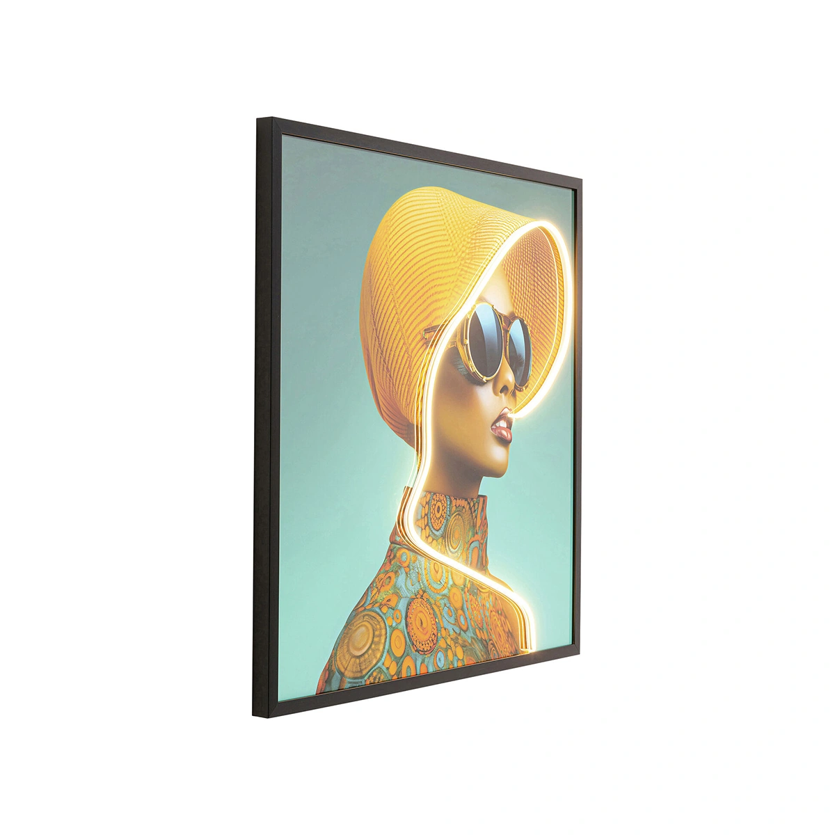 The key features include a stylish woman with a wide-brimmed hat in rich yellow, framed in simple black, bringing a vacation flair and fashionable sophistication. The picture measures 80 x 80 x 3 centimeters and is illuminated by LED effects in sunny yellow, creating an unusual, dynamic visual experience.