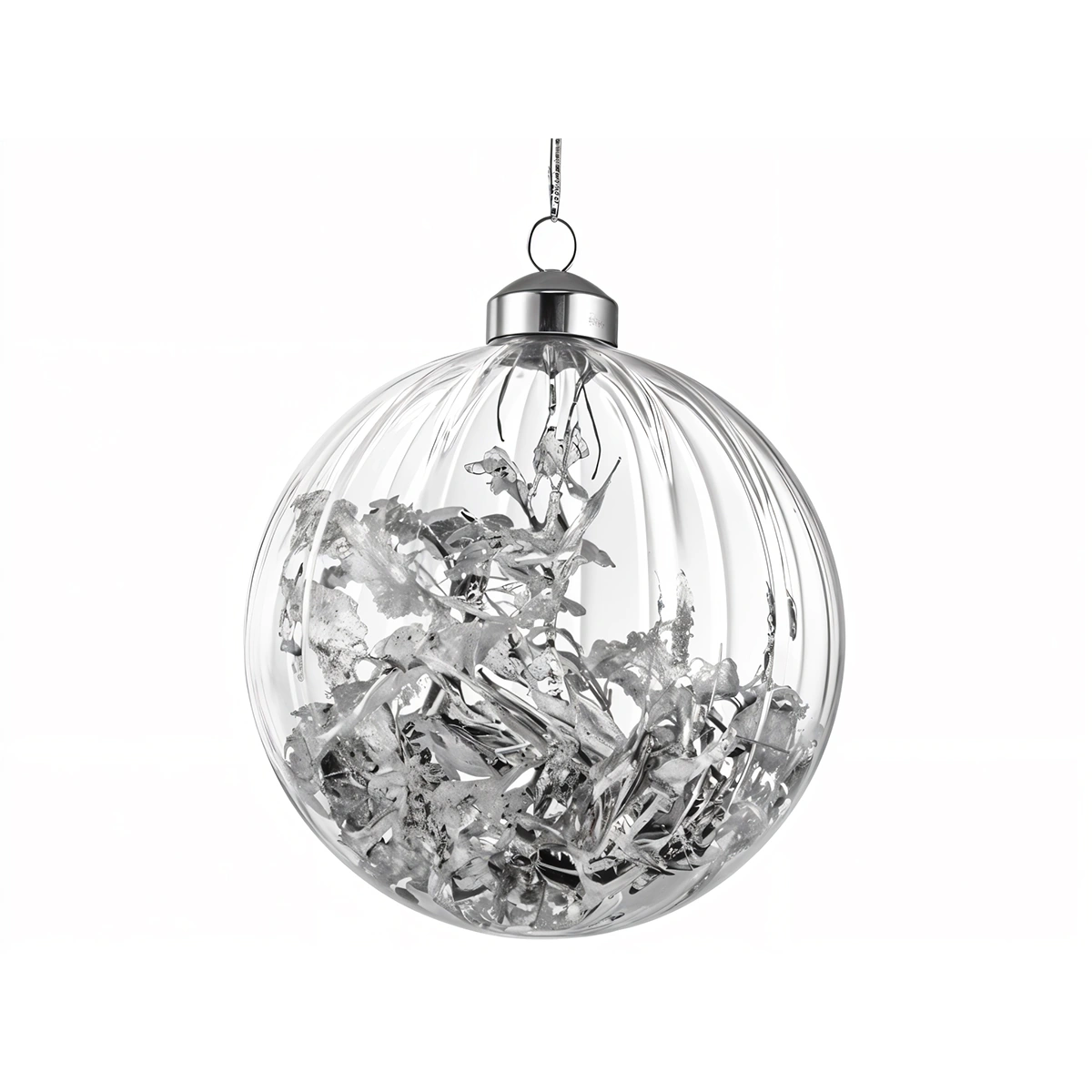 The Large Clear Silver Leaf Lined Glass Ball is an elegant addition to any living space. Its radiant cool tones and modern design create a captivating ambience.