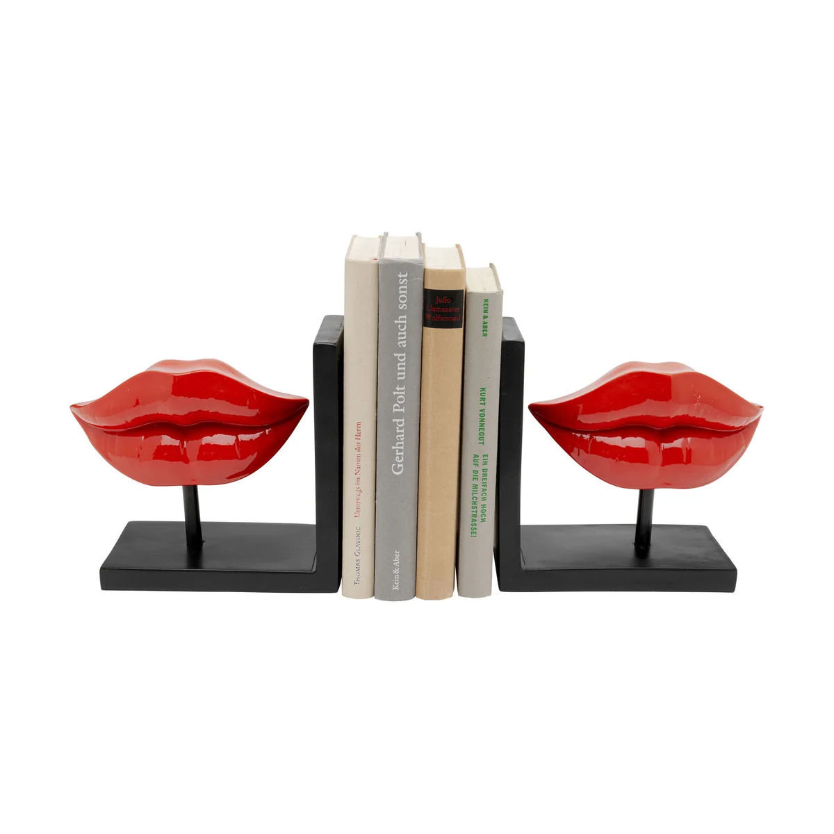 Key features of this bookend set include the expressive lip design in bright red that exudes a modern and artistic character, and the solid supports that provide stable support for books. With dimensions of 16.5 x 34.5 x 9 centimeters, they are perfect for any bookshelf or sideboard.