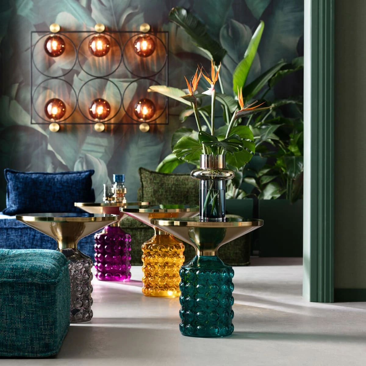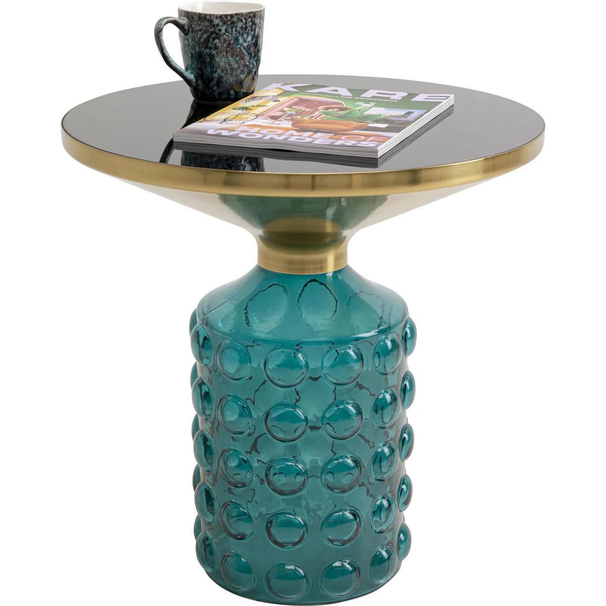 The Lola Side Table in blue glass with a black top is a statement piece for style-conscious interiors.