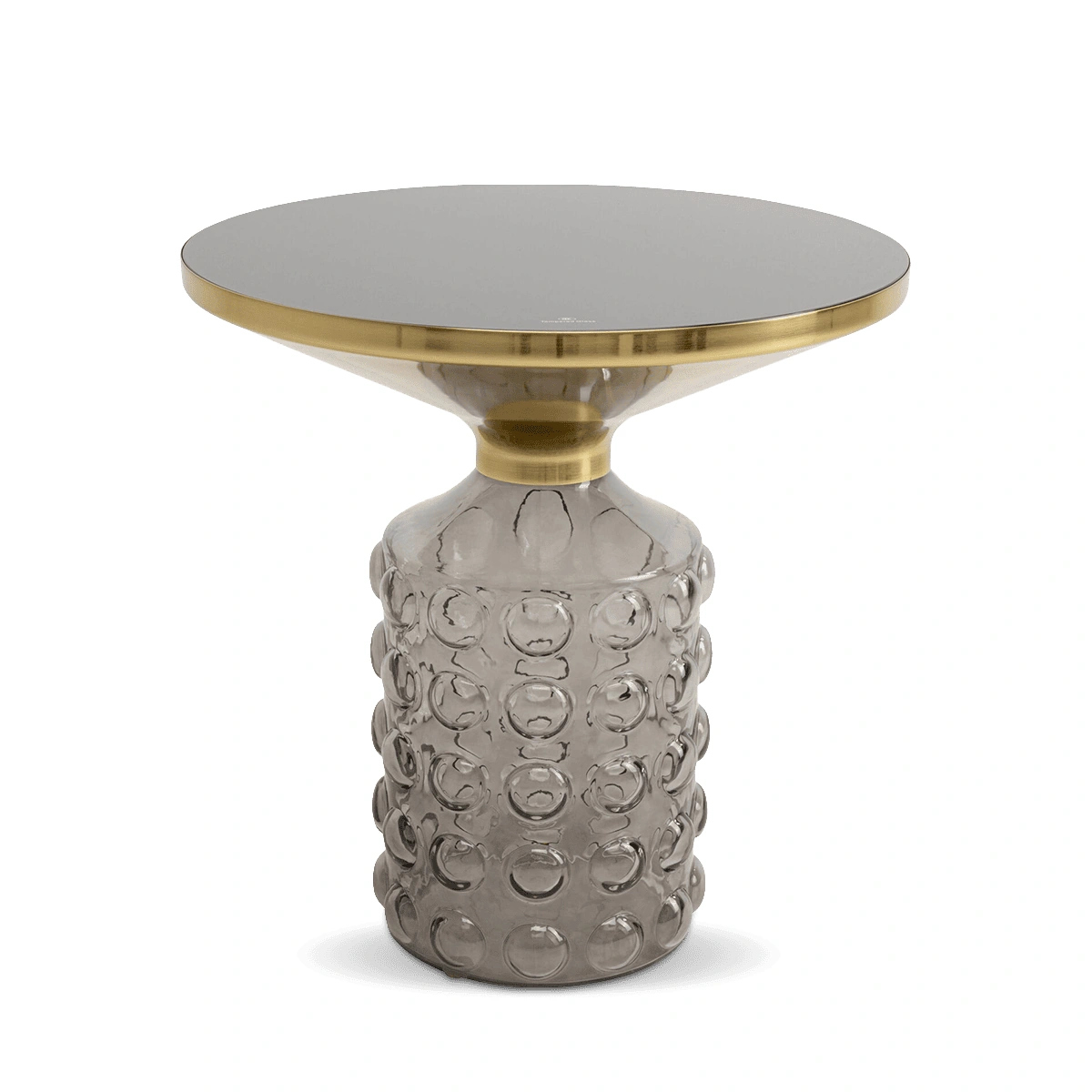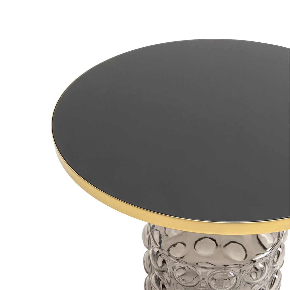 Key features of this table include a round glass side table, measuring 52 x 50 x 50 centimeters. The dynamic grey tinted glass leg sets the tone, while the black glass top offers ample space for drinks, magazines, or remote controls. Gold details made of robust, lacquered steel lend a touch of glamour to the table.