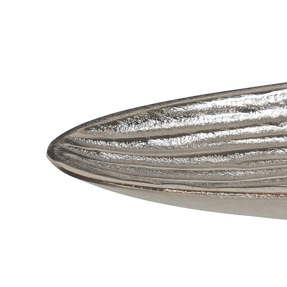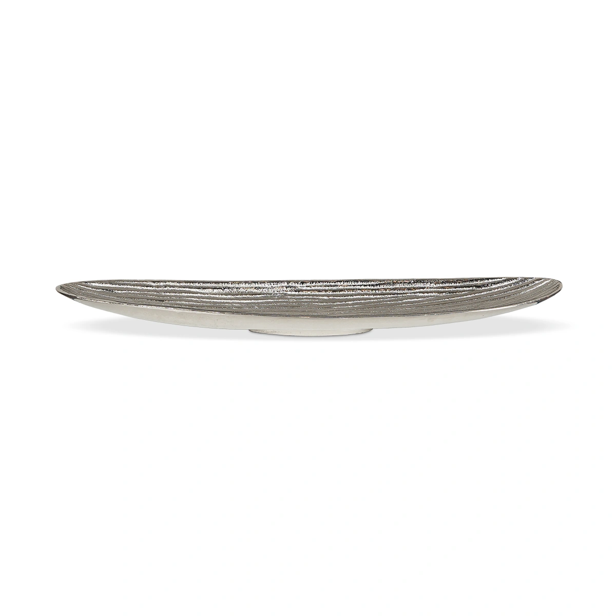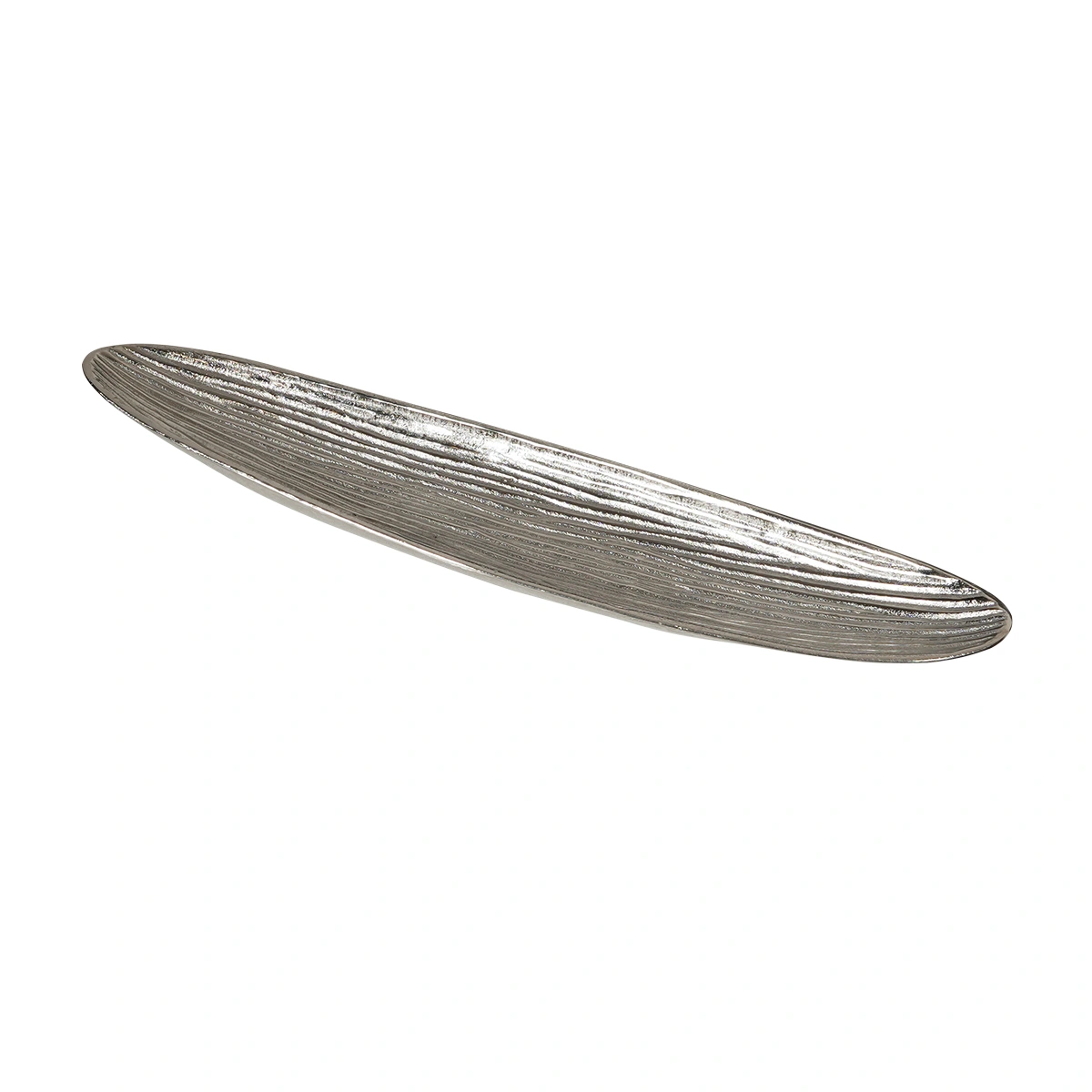 Enhance your living space with our Patterned Long Boat Bowl in Raw Silver. This elongated centerpiece, crafted from aluminum with a raw silver finish, exudes modern charm and makes a striking addition to your home decor.