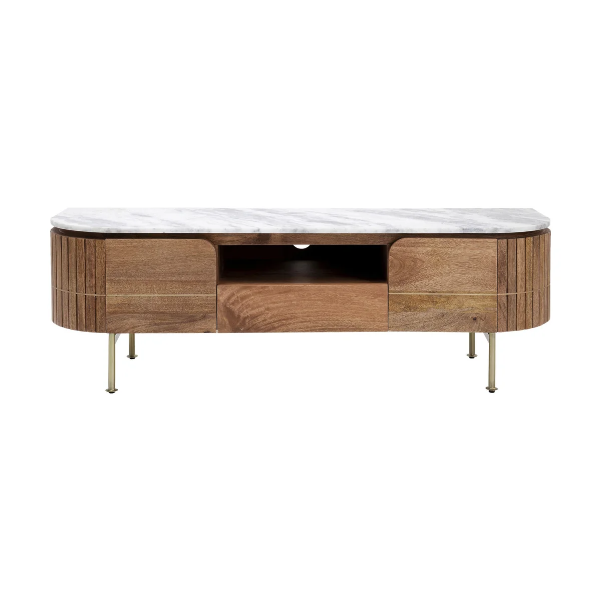 Modern, classy and with a touch of luxury, this lowboard will take your living area to the next level in terms of interior. The combination of the processed materials is a spectacle in itself. Made of solid mango wood with a high-quality marble top and golden legs, this living room furniture is brimming with style. The oval shape with decorative trim on the sides also adds the finishing touch. Not without reason, the TV board is a unique piece thanks to its handcrafted manufacturing. In the living room or dining room: the TV cabinet is an all-rounder and offers enough space for your electronics and documents with two doors and one drawer - in addition, the hinges are adjustable.