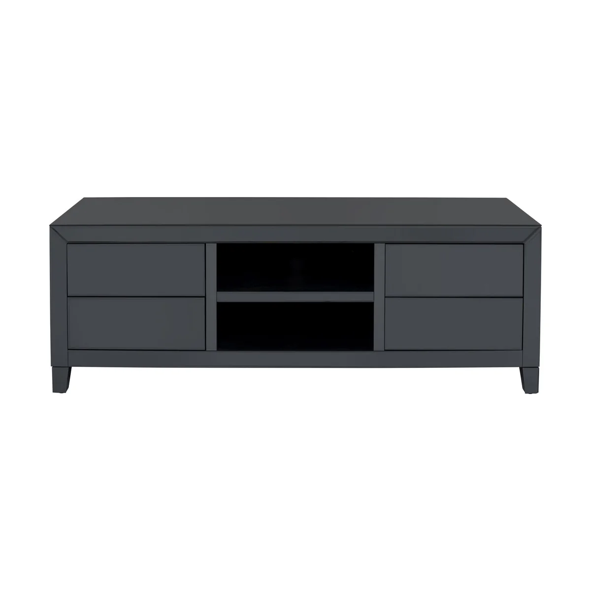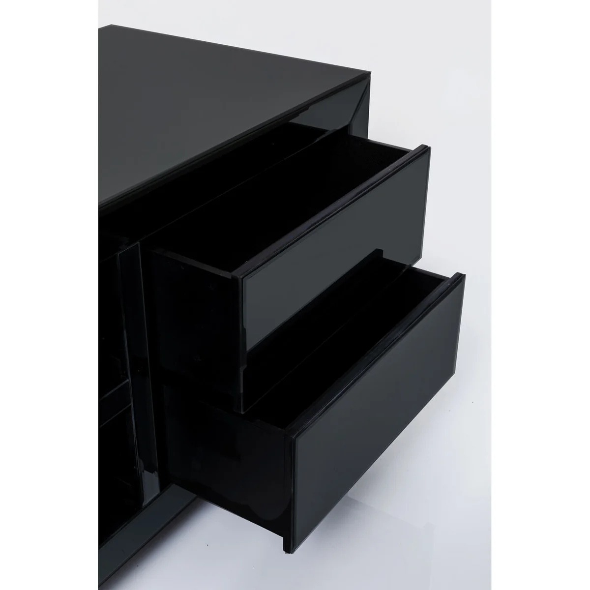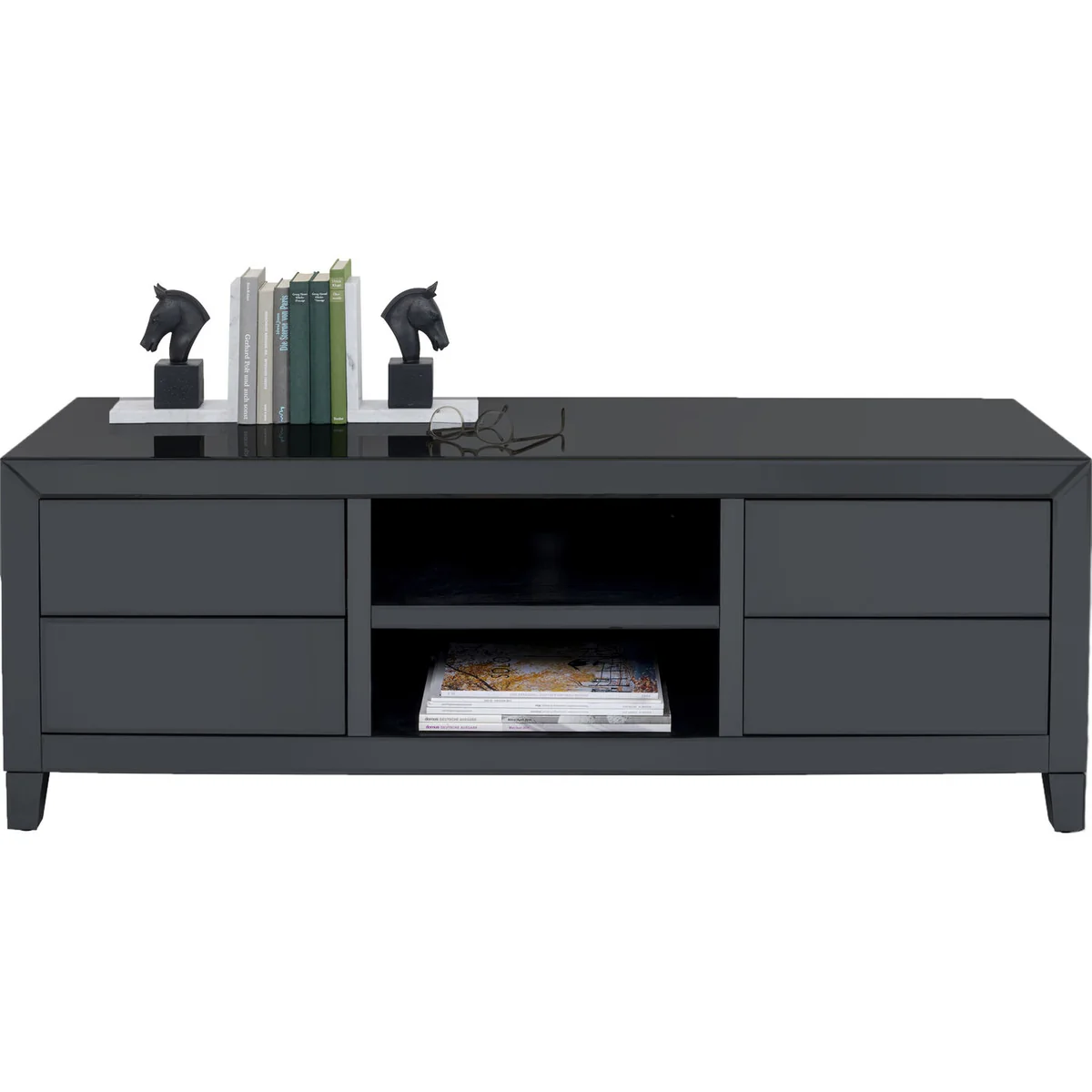 - A lowboard from the Luxury collection in grey tinted, mirrored glass - Straight-lined elegance with a dash of cool glamour for any room - The reflecting mirror surfaces skilfully set the scene in rooms (not cabinet) - Practical storage space: the four drawers have a push-to-open function, the shelf is fixed - Also ideal as a glamorous TV cabinet
