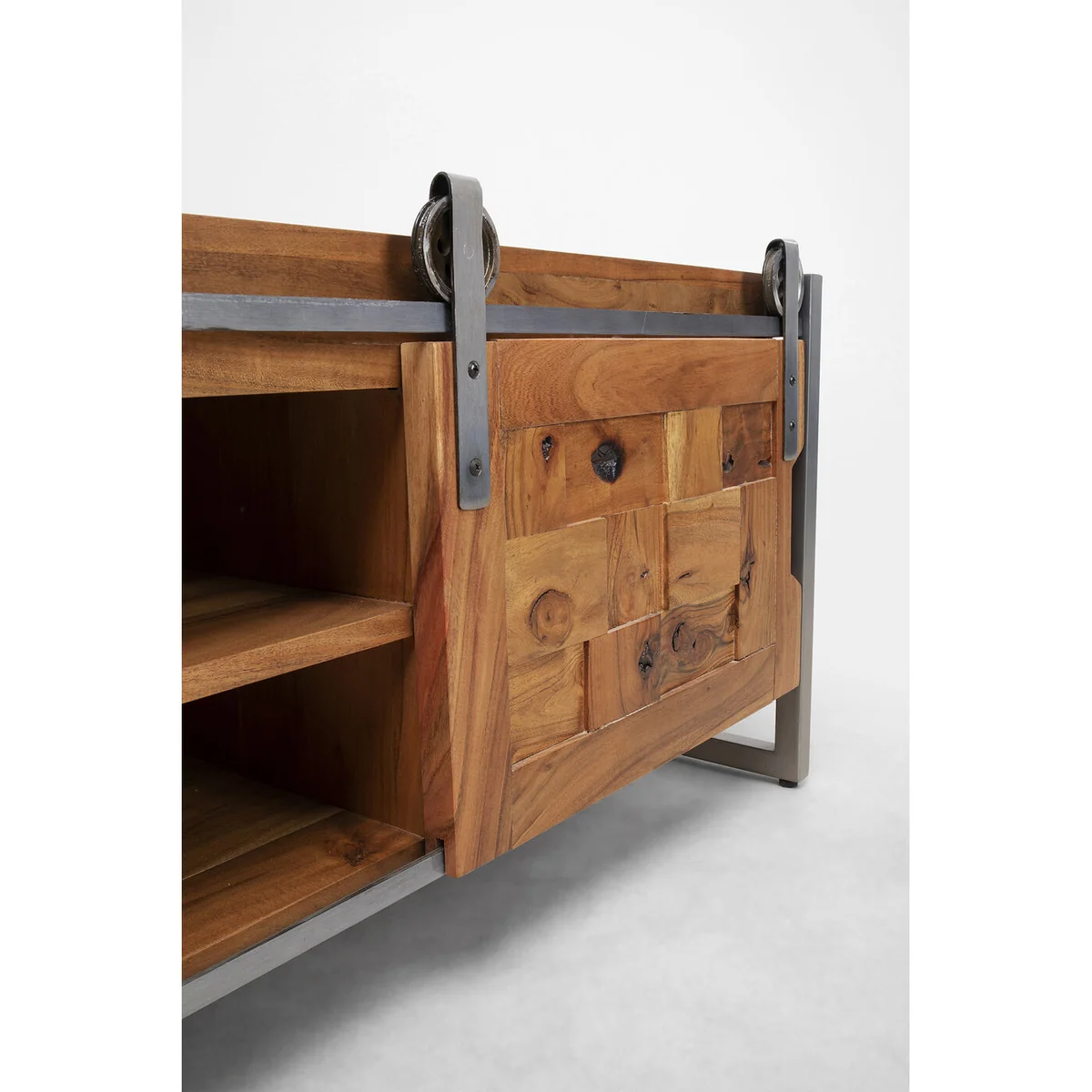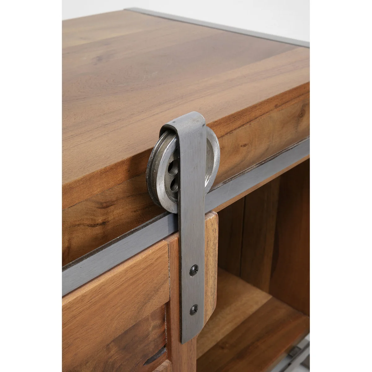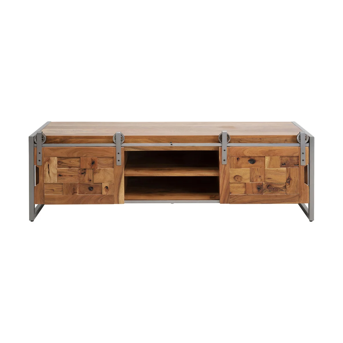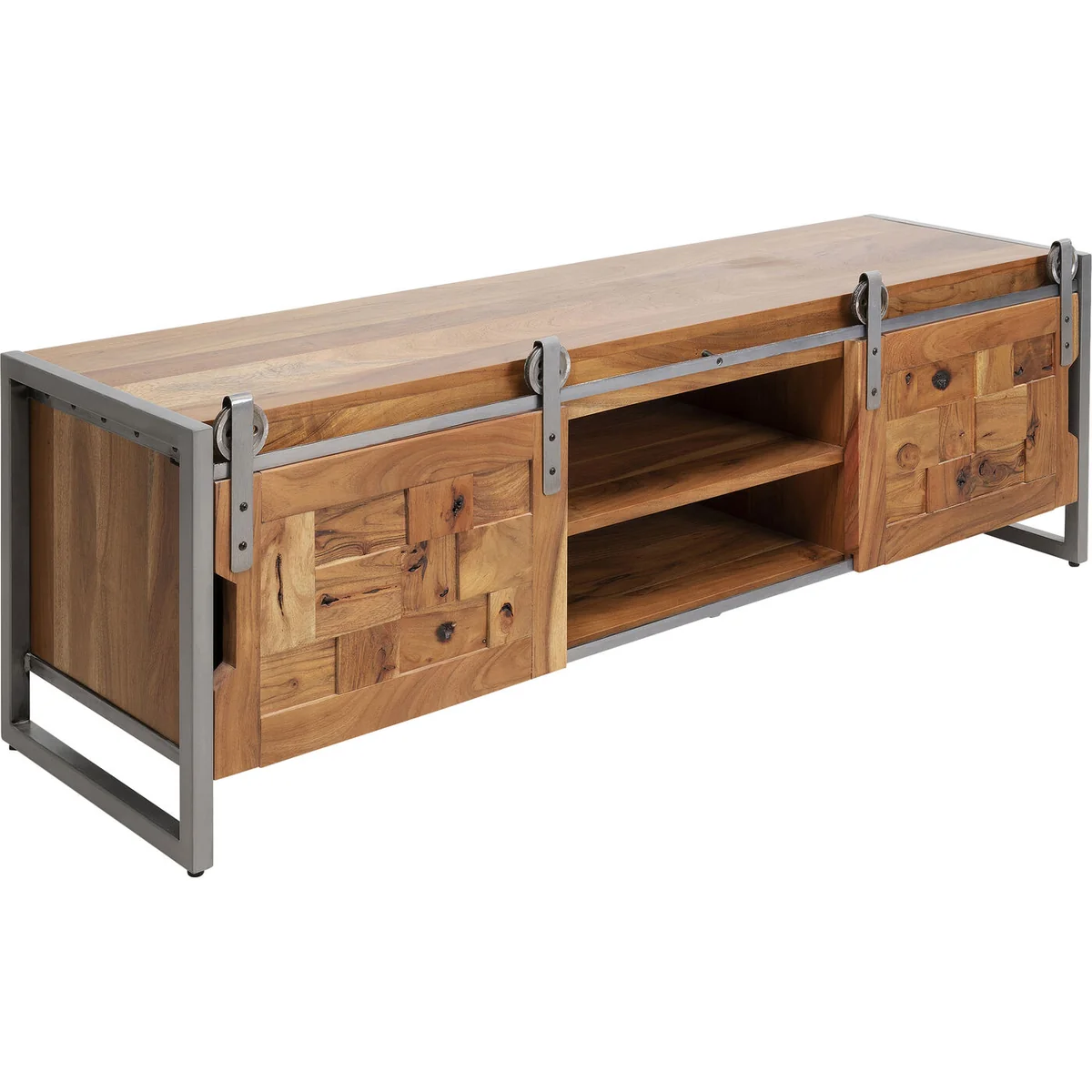 This sideboard for the living room is a practical piece of furniture that is a perfect match for a variety of home styles. It looks just as good in a country house as it does in a loft. With its unique design and the use of solid acacia wood, it is also an eye-catcher in any room. The lowboard has two sliding doors and open compartments that allow for flexible storage of bits and pieces. Particularly interesting are the frame and the rollers made of metal for the sliding doors, which give this piece of furniture an industrial touch. The low living room cabinet is crafted by hand and each piece is unique.