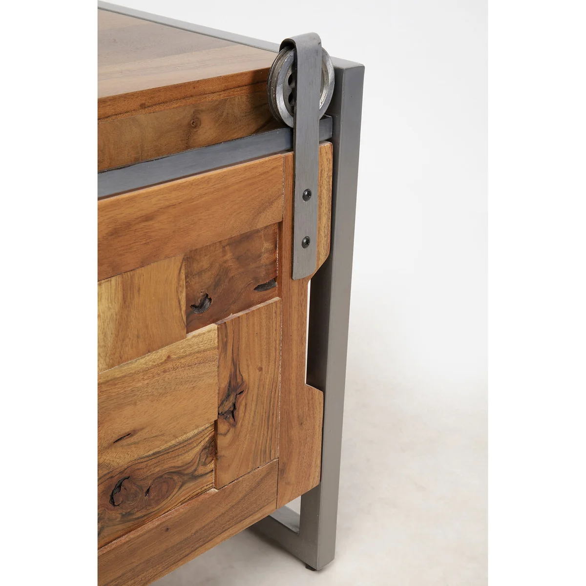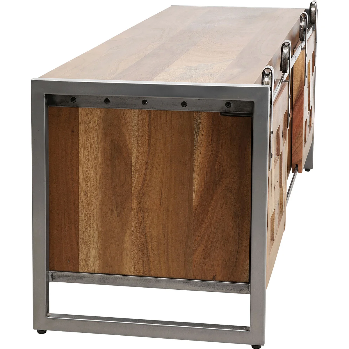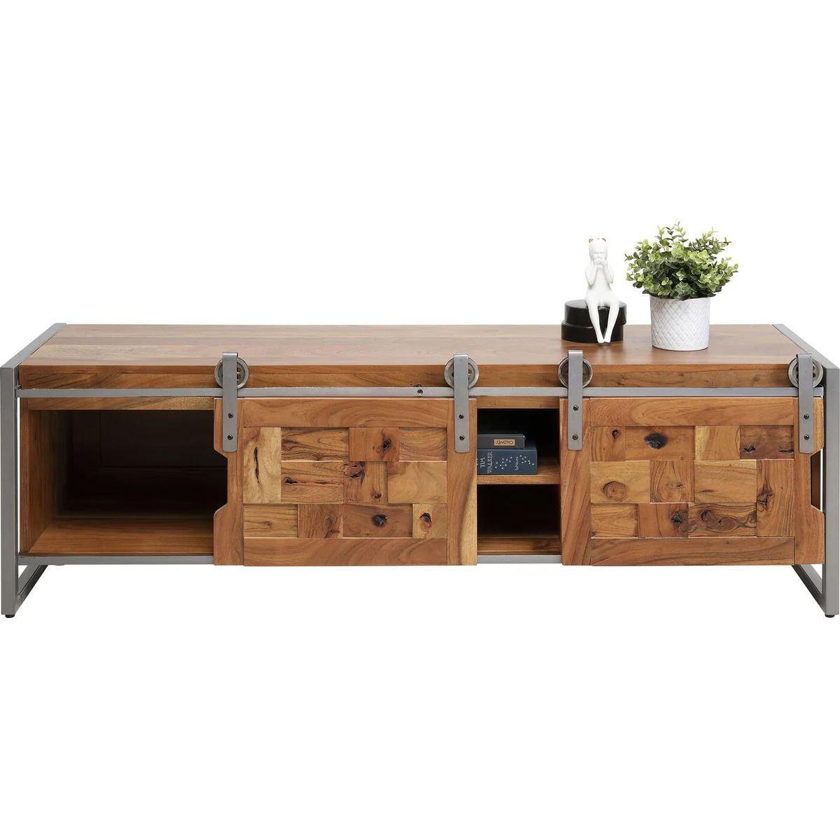 This sideboard for the living room is a practical piece of furniture that is a perfect match for a variety of home styles. It looks just as good in a country house as it does in a loft. With its unique design and the use of solid acacia wood, it is also an eye-catcher in any room. The lowboard has two sliding doors and open compartments that allow for flexible storage of bits and pieces. Particularly interesting are the frame and the rollers made of metal for the sliding doors, which give this piece of furniture an industrial touch. The low living room cabinet is crafted by hand and each piece is unique.