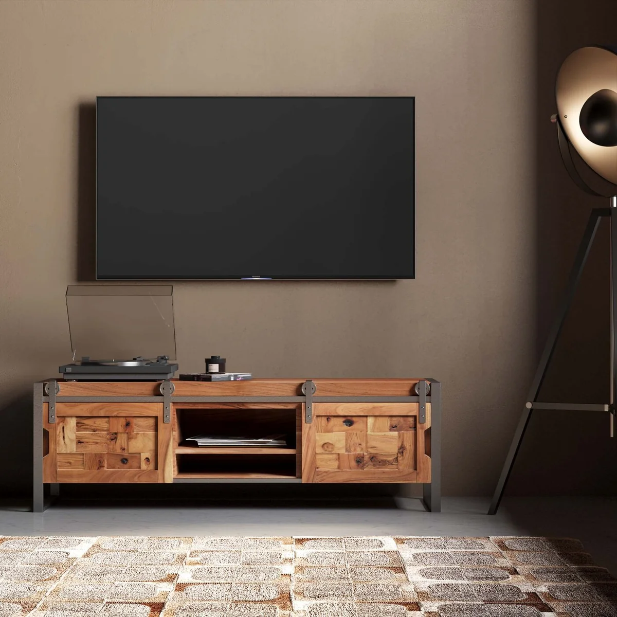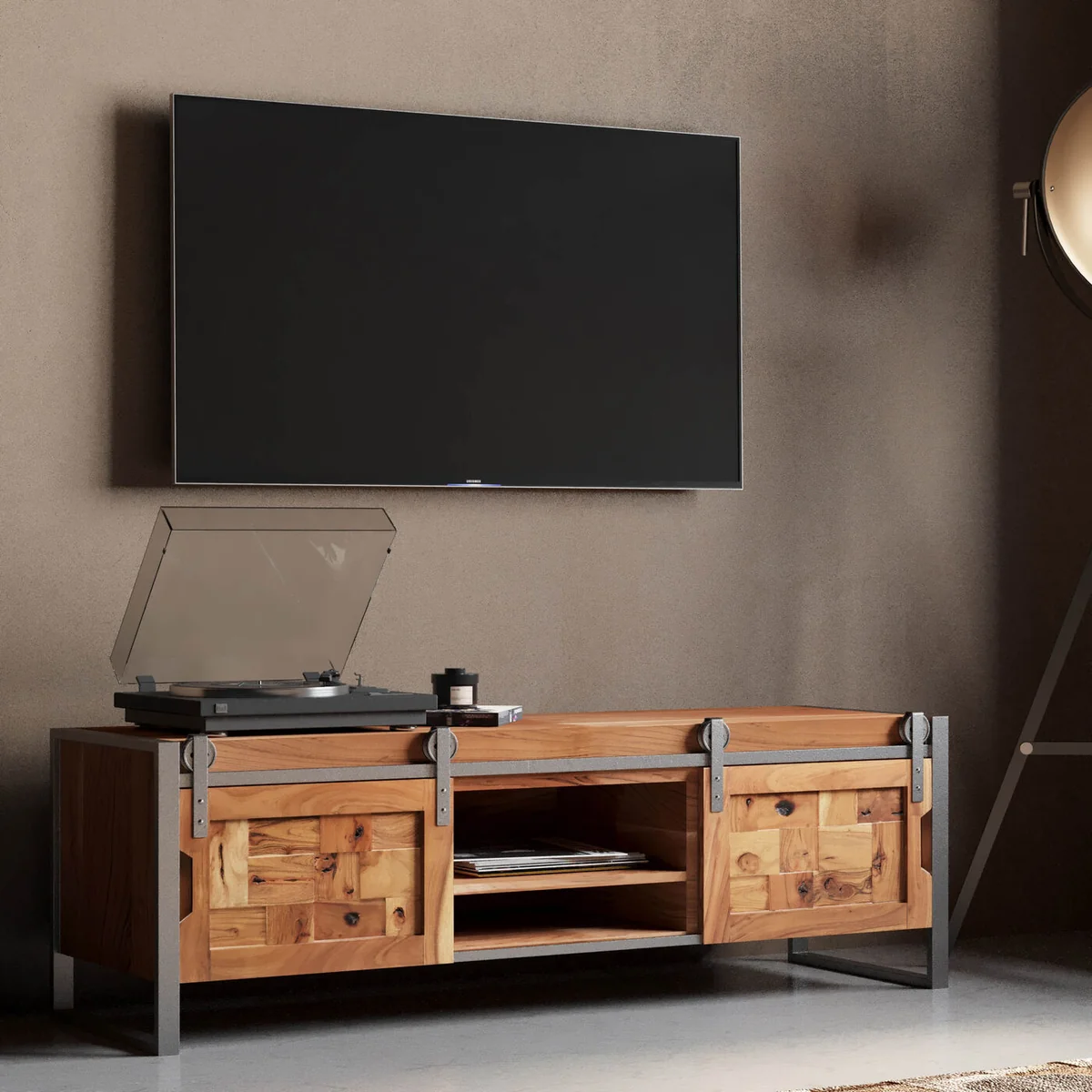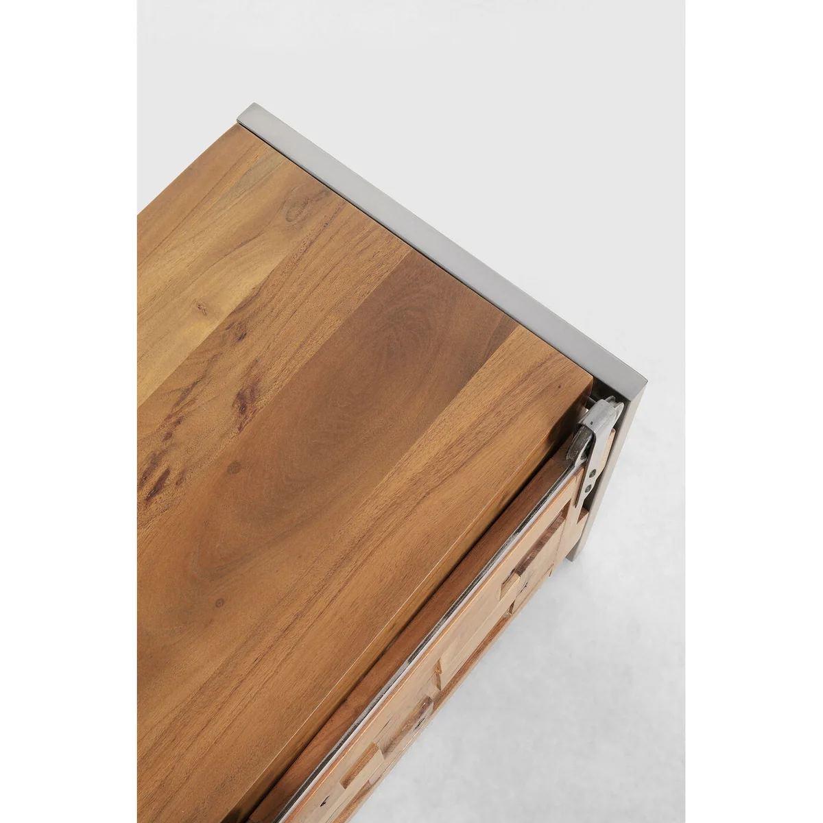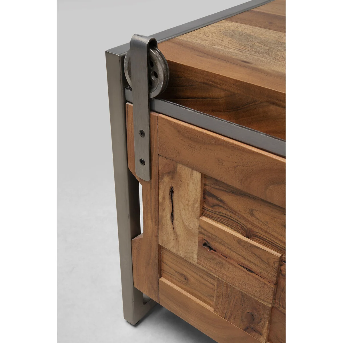 This sideboard for the living room is a practical piece of furniture that is a perfect match for a variety of home styles. It looks just as good in a country house as it does in a loft. With its unique design and the use of solid acacia wood, it is also an eye-catcher in any room. The lowboard has two sliding doors and open compartments that allow for flexible storage of bits and pieces. Particularly interesting are the frame and the rollers made of metal for the sliding doors, which give this piece of furniture an industrial touch. The low living room cabinet is crafted by hand and each piece is unique.