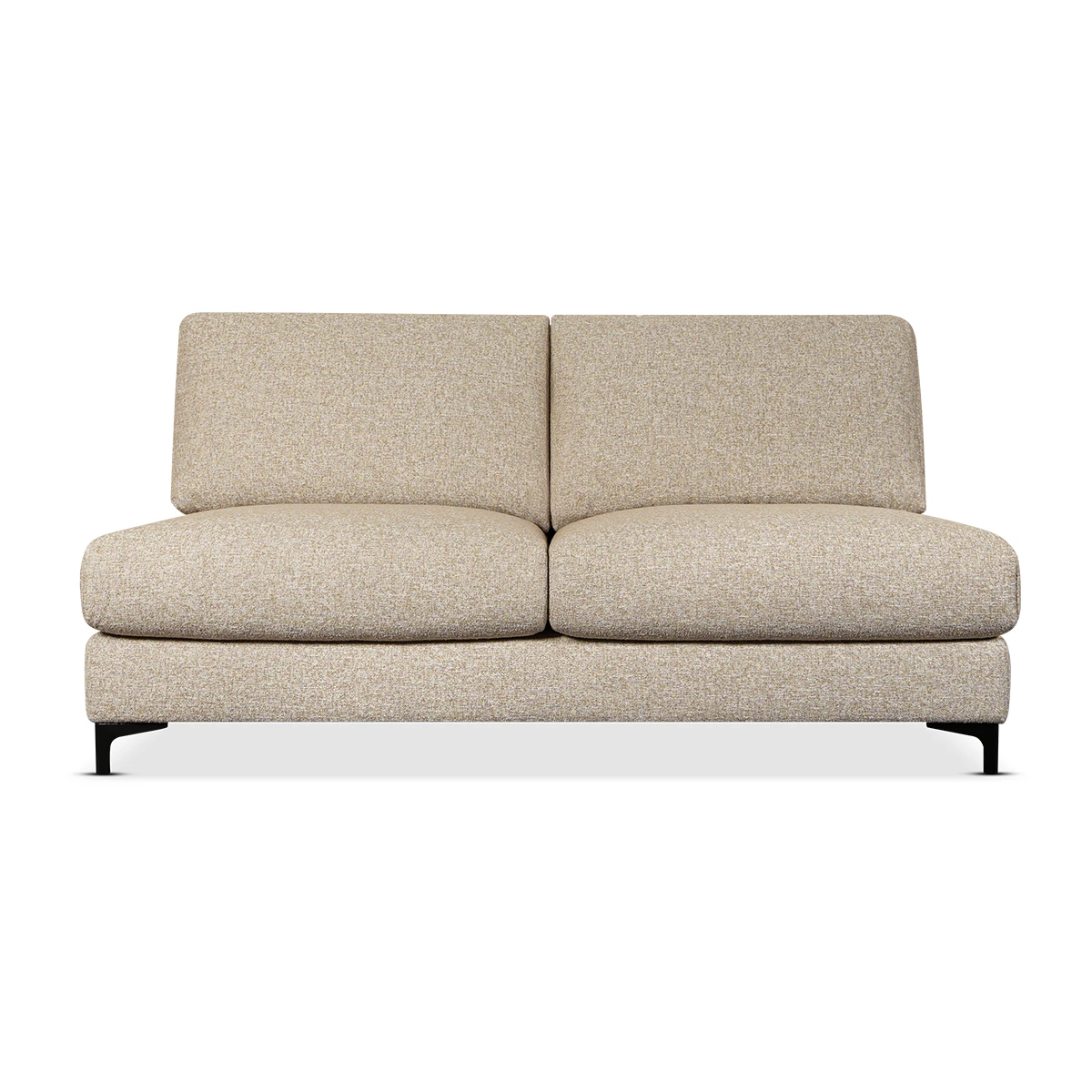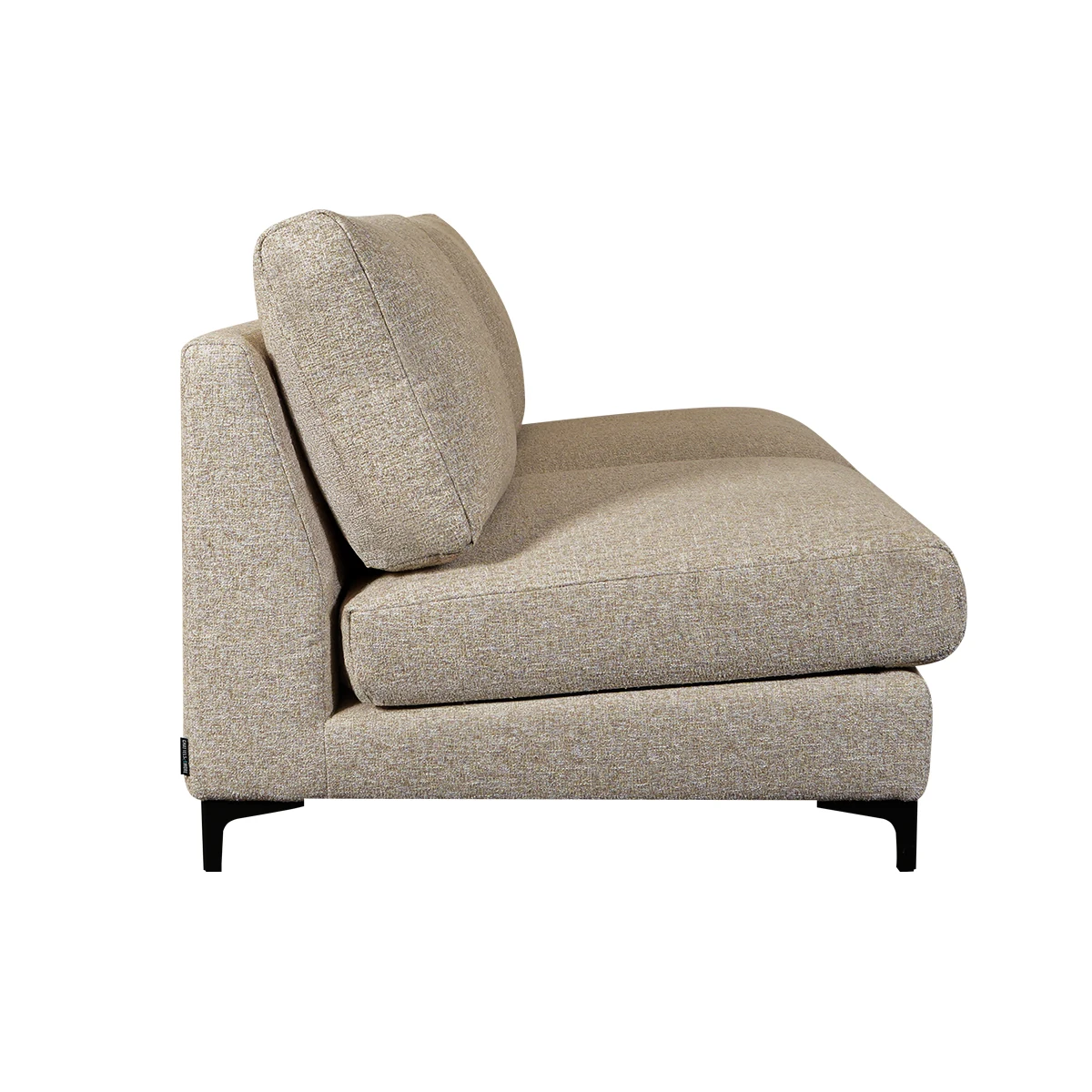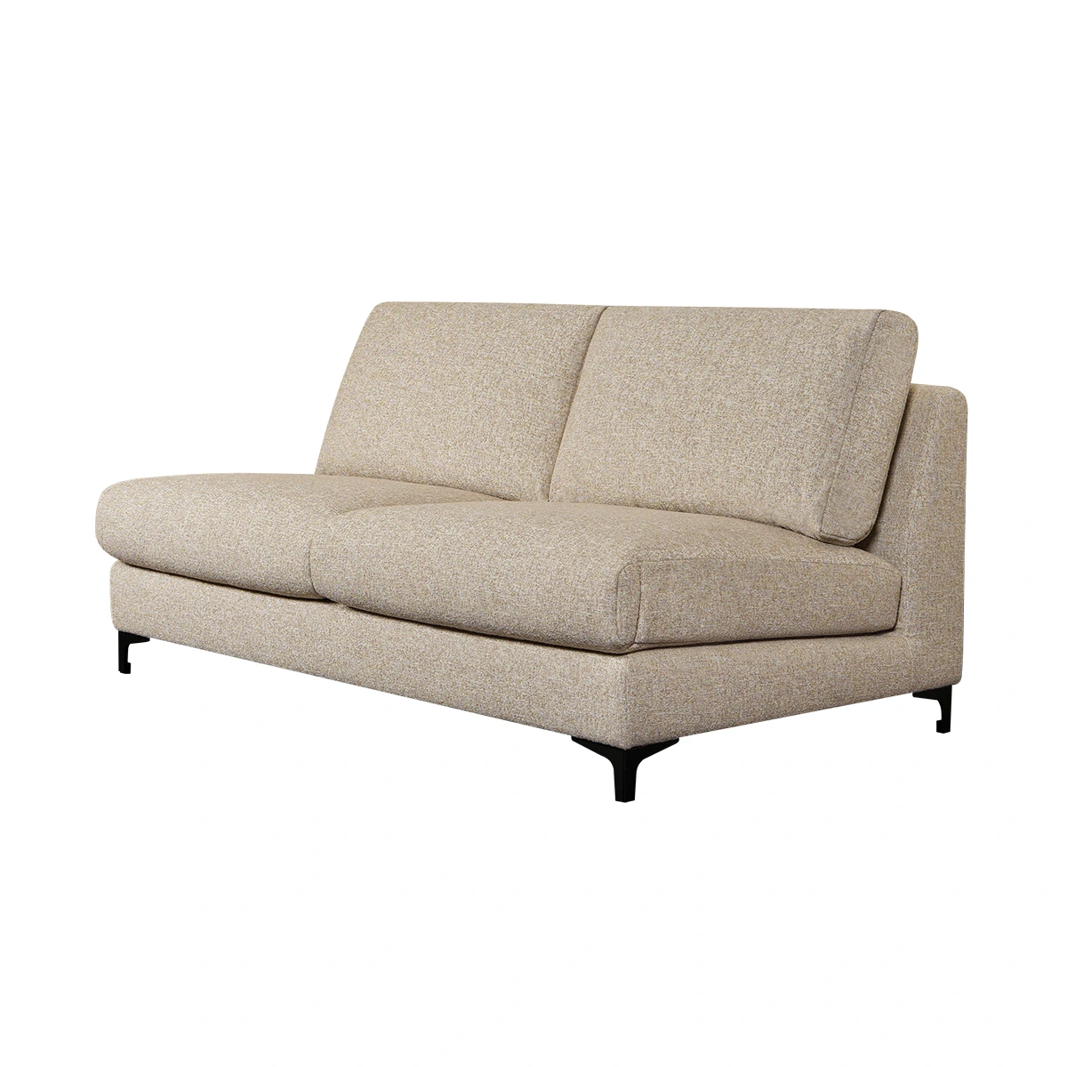 The Lua Modular Two Seater Element in Light Beige offers generous seating within a clean modular design. Ideal for modern living spaces, it provides balanced comfort while fitting seamlessly into customized sofa configurations. Upholstered in Corbett 21 100% polyester fabric, the sofa features deep cushions supported by zig-zag springs and HR foam. Its sturdy beech and spruce wood frame ensures durability, while black metal legs maintain stability and a sleek contemporary finish.
