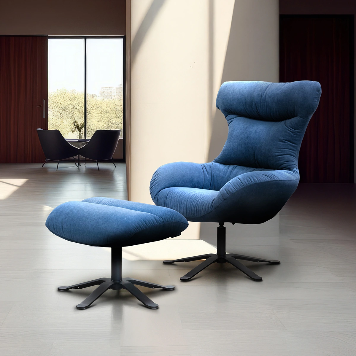 This lounge chair set enhances relaxation, comfort, and contemporary styling. Its blue upholstery adds calm elegance to interior spaces.
