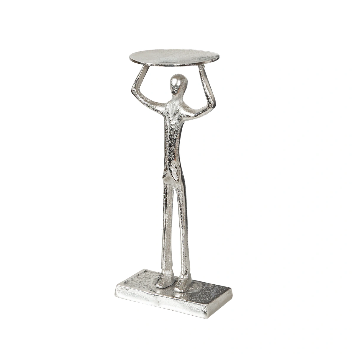 The Small Man Lifting Pillar Holder in Raw Silver is a striking piece of home decor that adds a touch of artistic flair to your interiors.