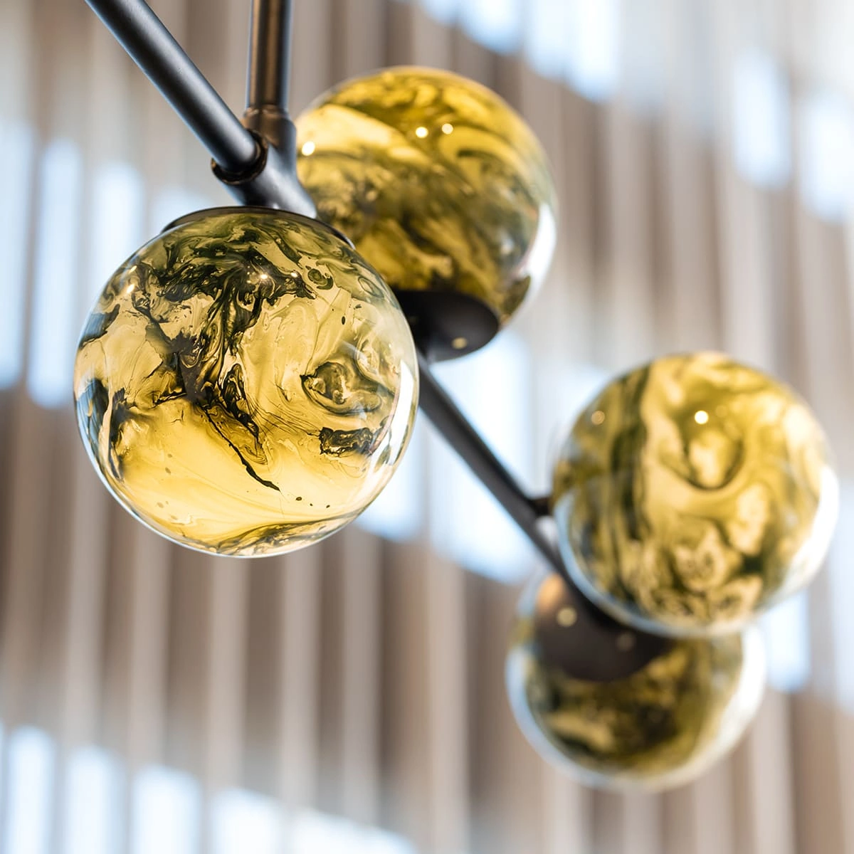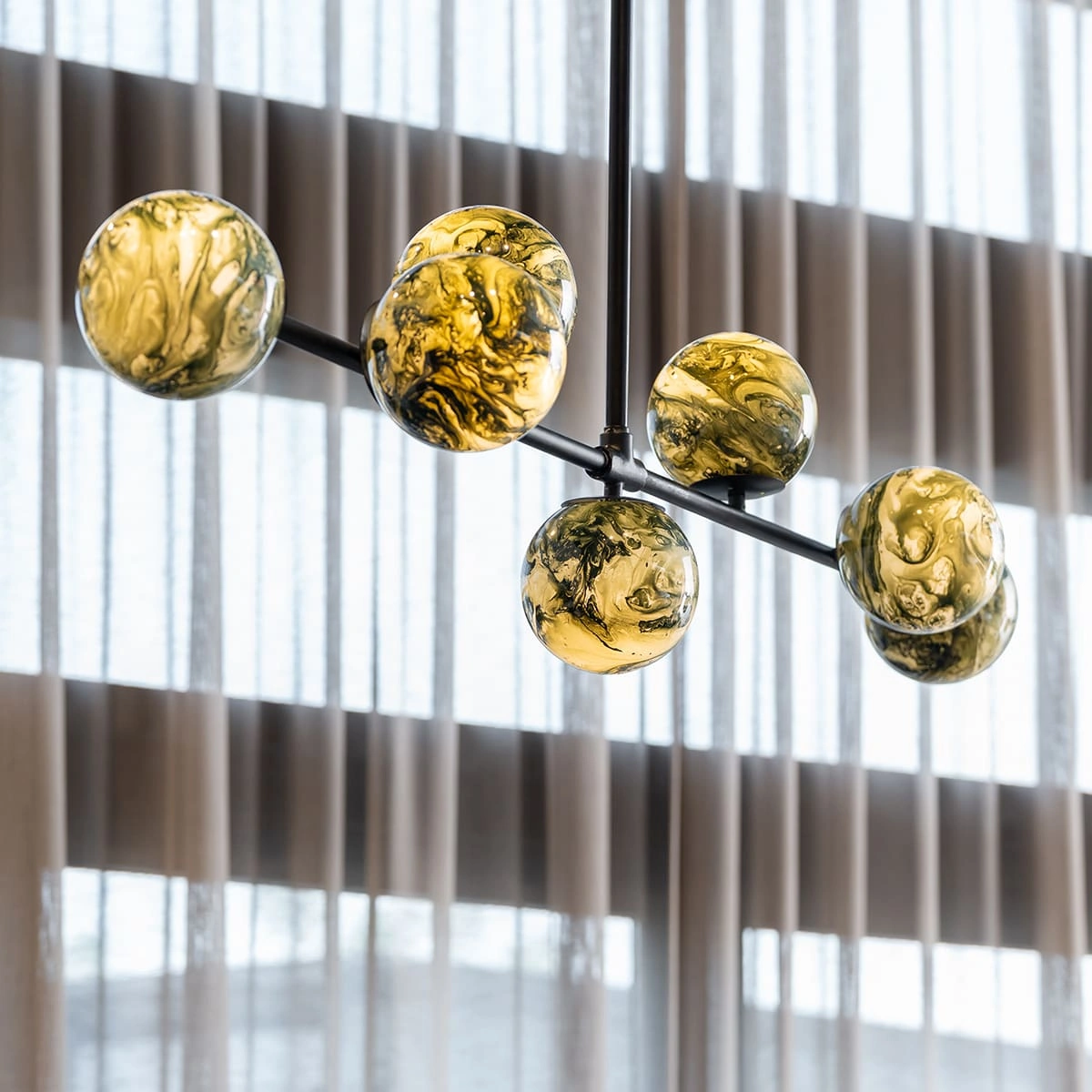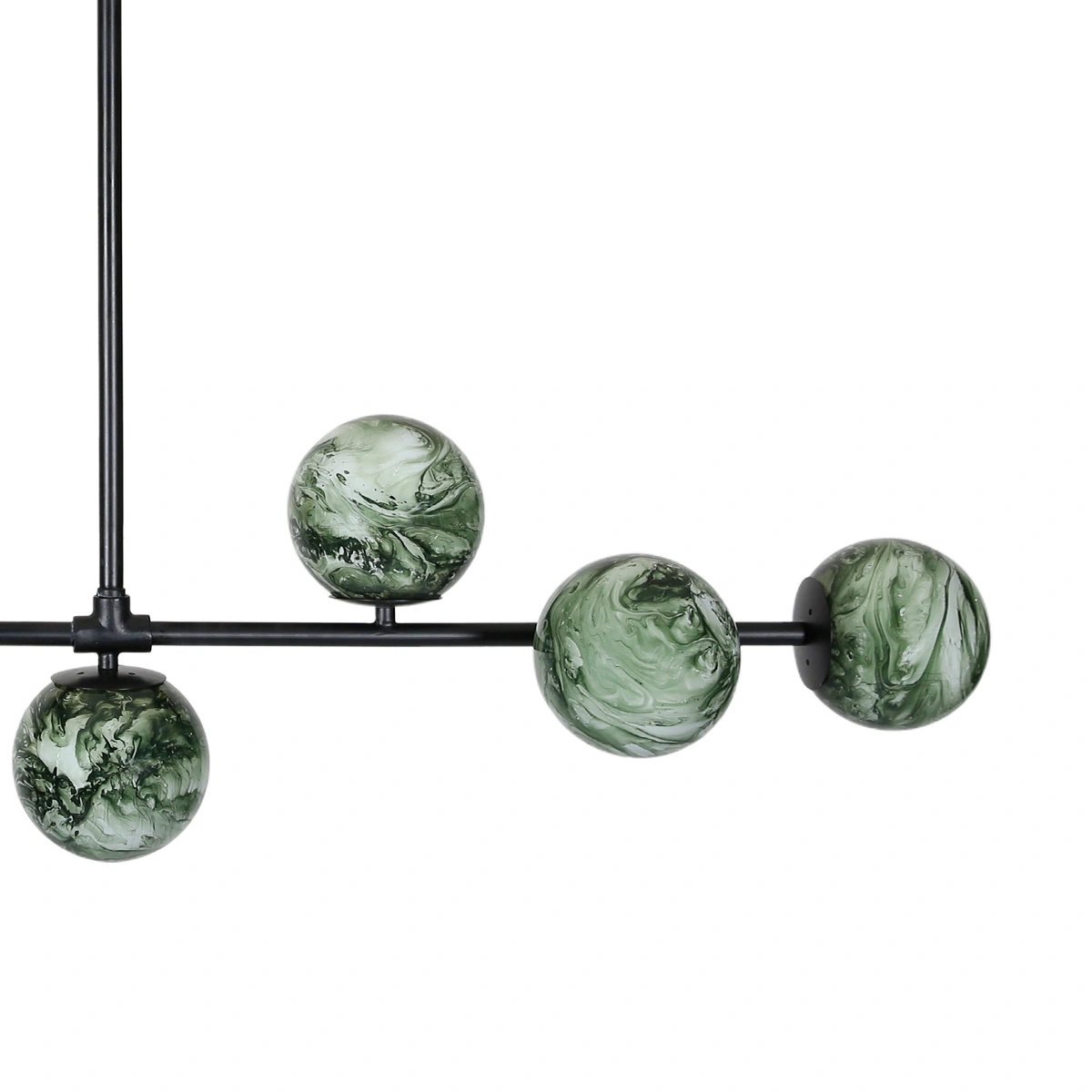 Illuminate your space with the Maribo Chandelier in black brass, a sophisticated blend of glass and iron. With its intriguing design, this piece will be the focal point of any room.