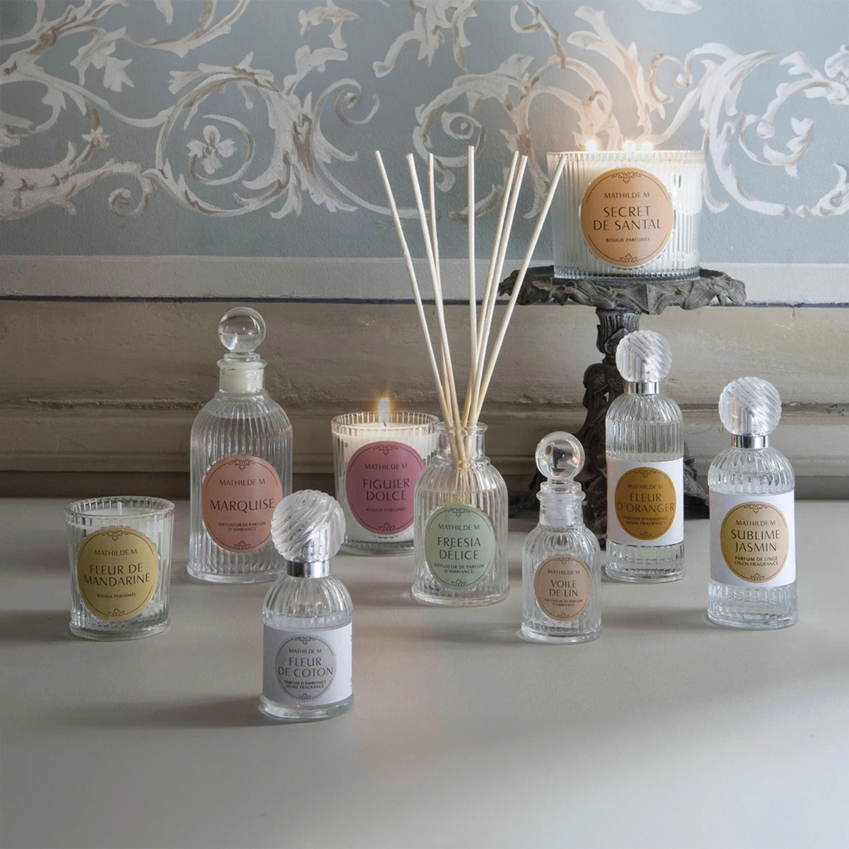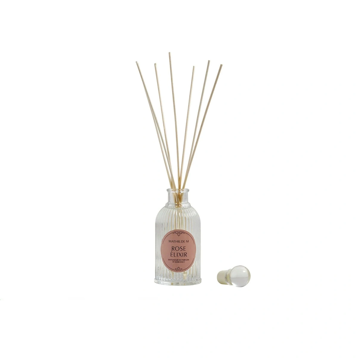 Discover Rose Elixir, a luxurious home diffuser blending rose, violet, and white musk. Elegant ribbed glass design scents your home with timeless beauty.