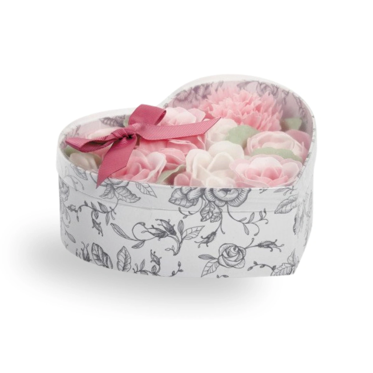 Elegant heart-shaped box with rose-scented soap flowers in nude and white. Gently lather each petal for a soft, fragrant cleanse. Ideal for gifting or self-care.