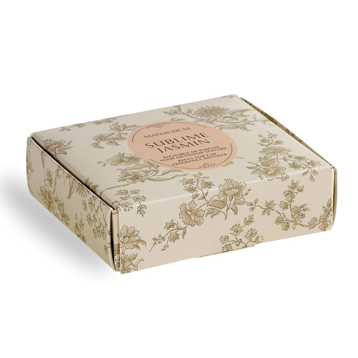 Enhance your drives with Mathilde M's Sublime Jasmin car diffuser refill set. Includes 2 scented refills and a spray featuring jasmine, orange blossom, vanilla, and white musk.