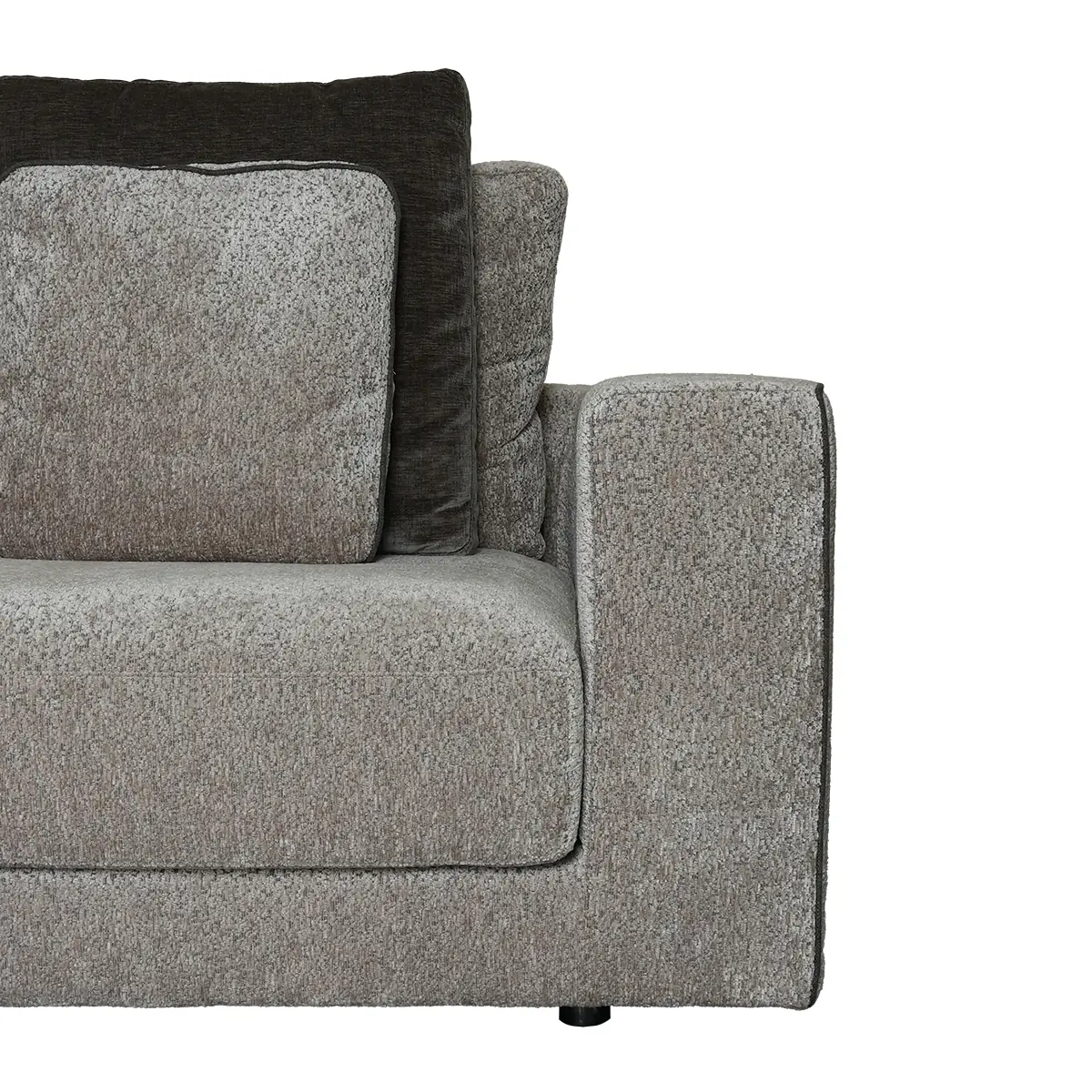 Crafted with a sturdy frame of pine wood, plywood, and chipboard, the Maxwell sofa ensures long-lasting structural support. The upholstery features a mix of Felix 6007 fabric and Colourwash piping for added texture and durability, while the extra cushions in 5058 Coverlet fabric enhance comfort. The back cushions are filled with a premium goose-feather and silicone blend for a soft, sink-in feel. Plastic legs provide lightweight stability without disrupting the clean aesthetic.