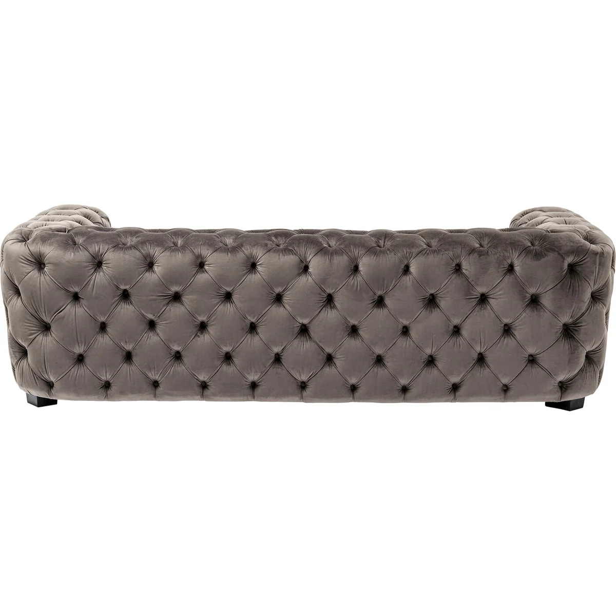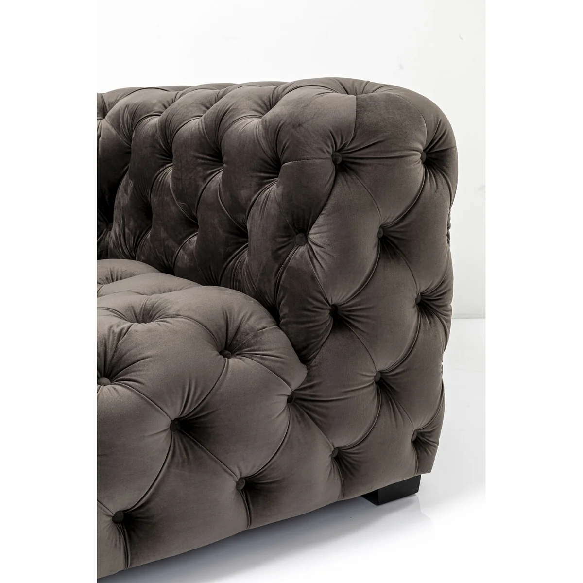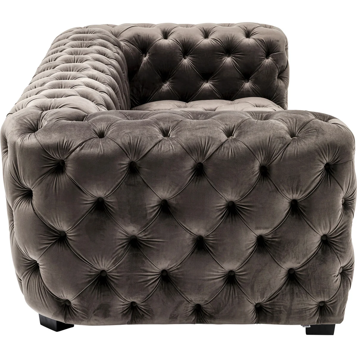 - Extra wide velvet sofa with arm and backrests at the same level in the classic Chesterfield style - handmade! - Four-seater couch in elegant grey - the ideal partner for combining with all interior colours - Especially comfortable thanks to the voluminous upholstery and the extensive width - you''ll love to stretch out on it! - Button-stitched all around: The traditional workmanship gives this upholstered sofa its characteristic distinctive look - Armchairs and couches in the Chesterfield style are popular furnishing solutions to introduce the industrial and loft style into rooms