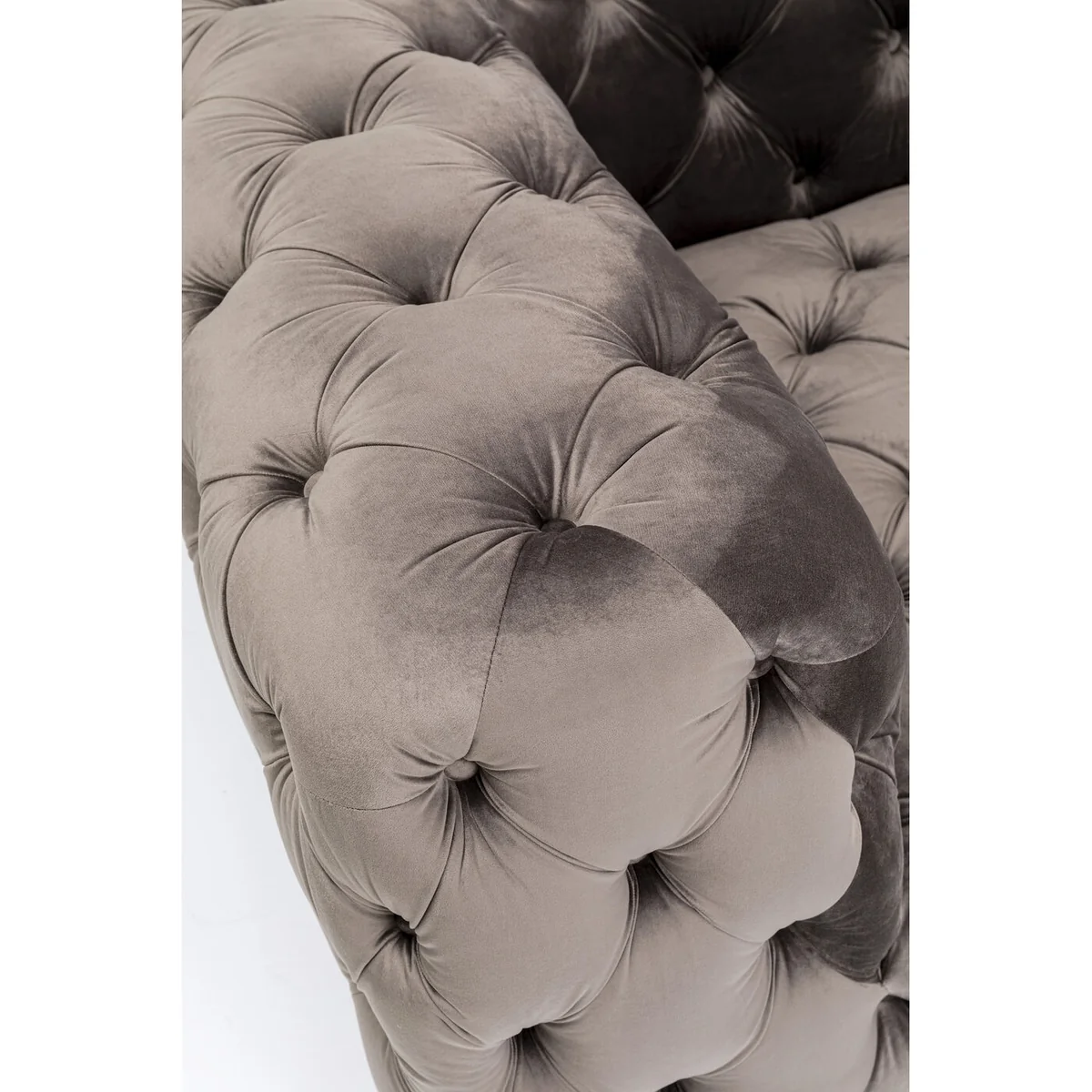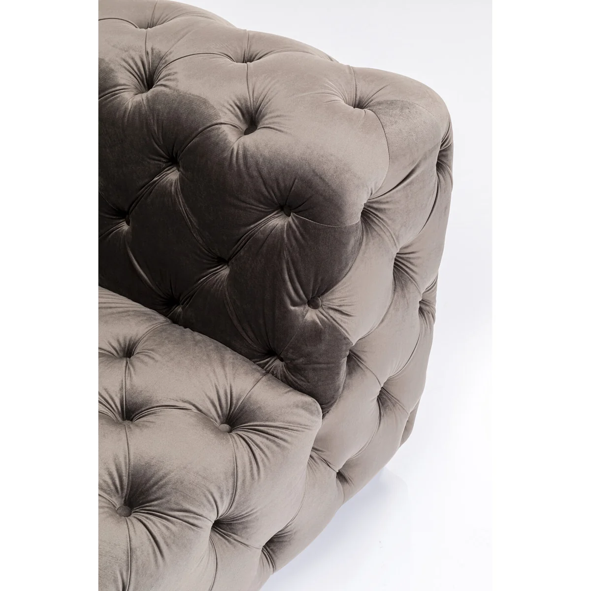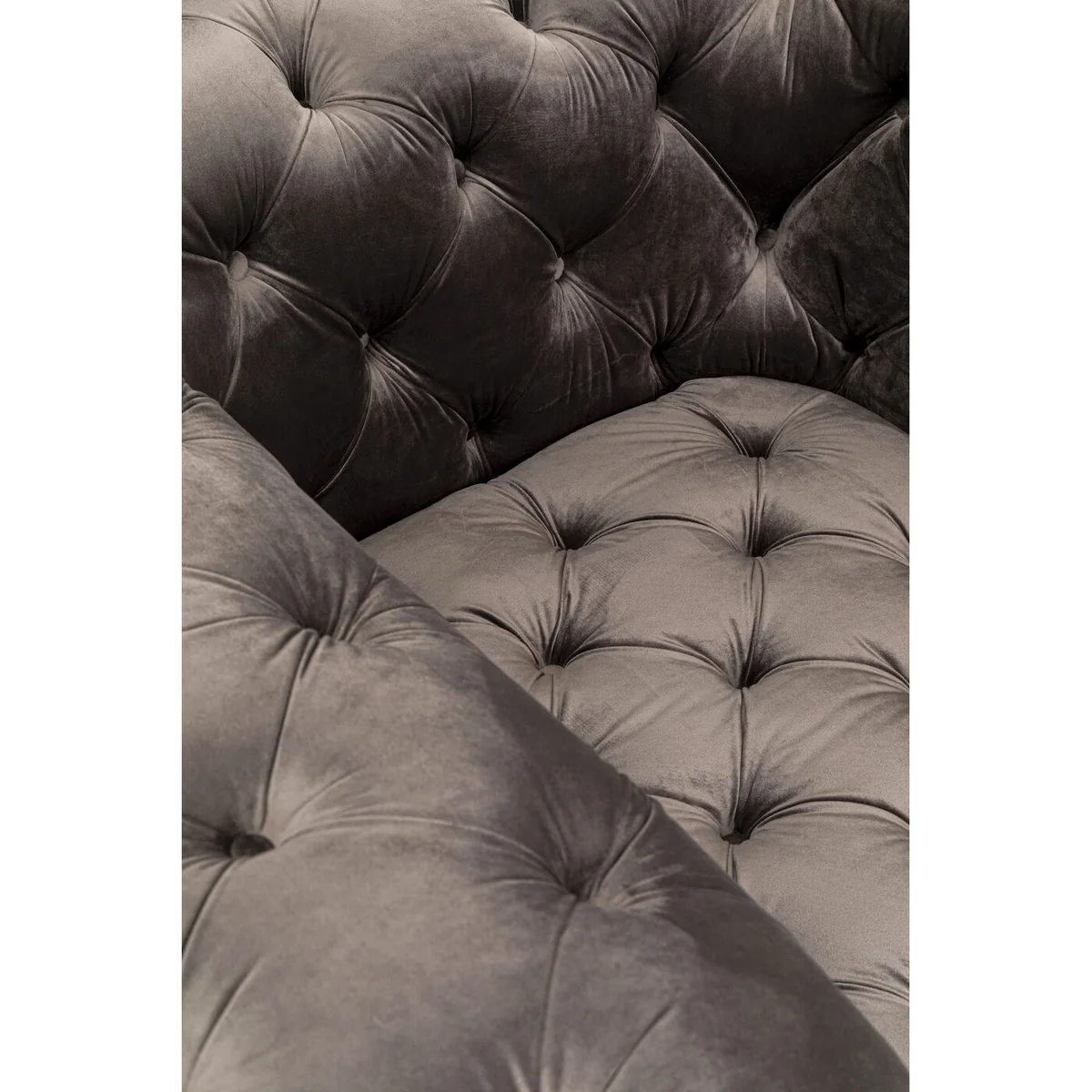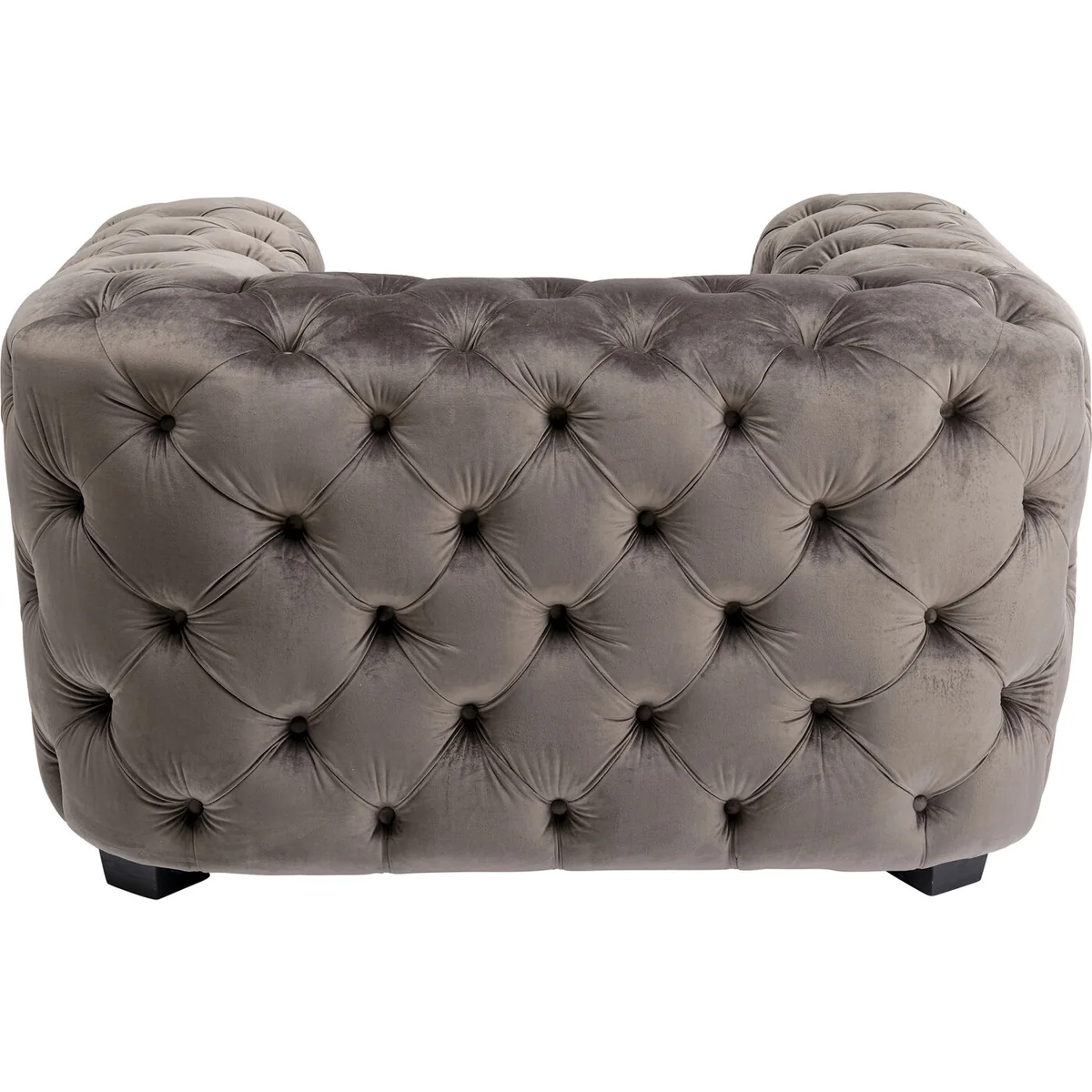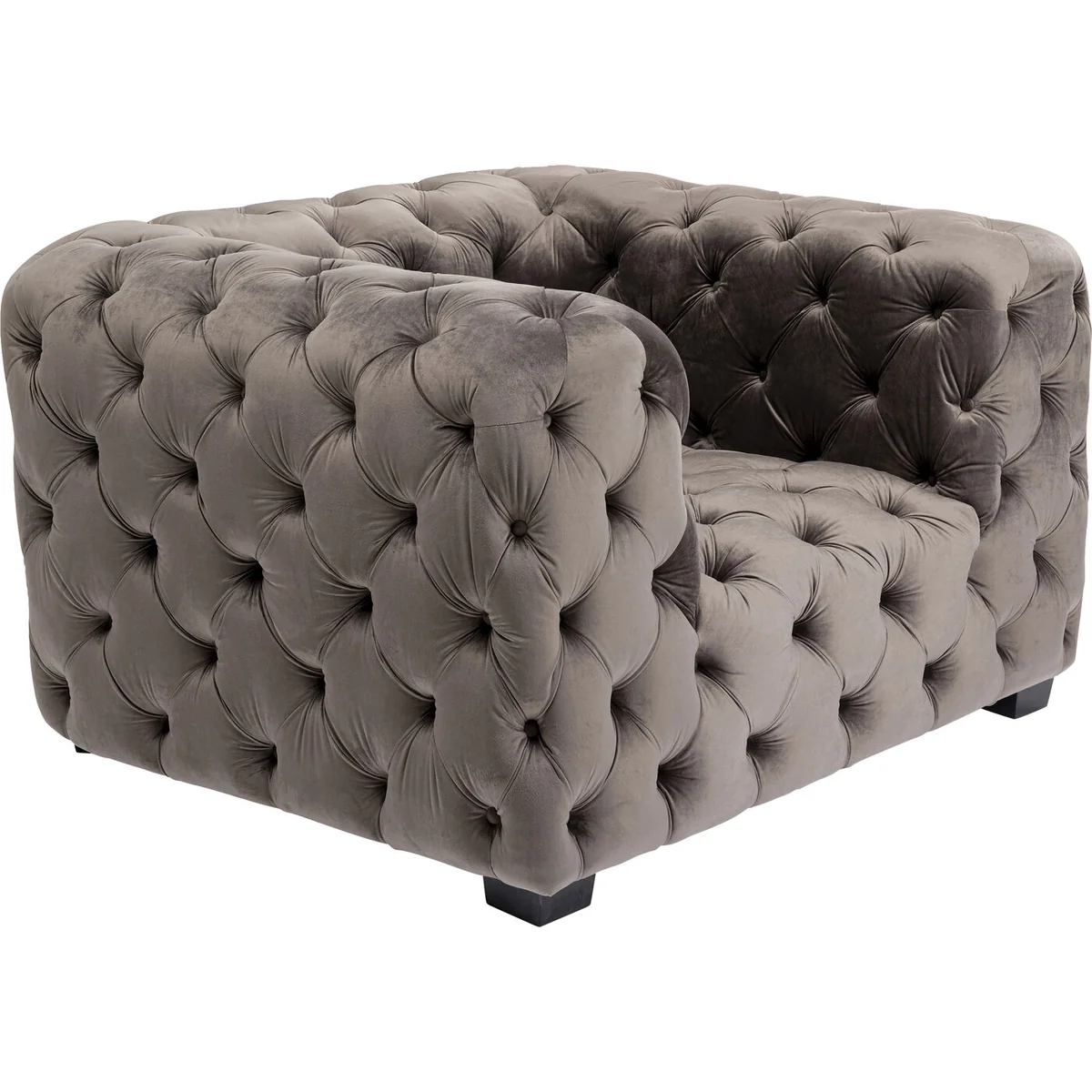 This eye-catching grey designer chair will win you over with its sumptuous and luxurious look. Chesterfield style armchairs and sofas are popular furnishing solutions to bring the industrial and loft style into rooms. Typical of classic Chesterfield upholstered furniture is the button-stitched upholstery and the curved shape. This club chair represents the modern version - cube-like and with a velvet-look cover, almost more inviting than the classic version in leather. This chair is ideal as a relaxing armchair in the living room, but also in the hallway or bedroom for that extra touch of cosiness.