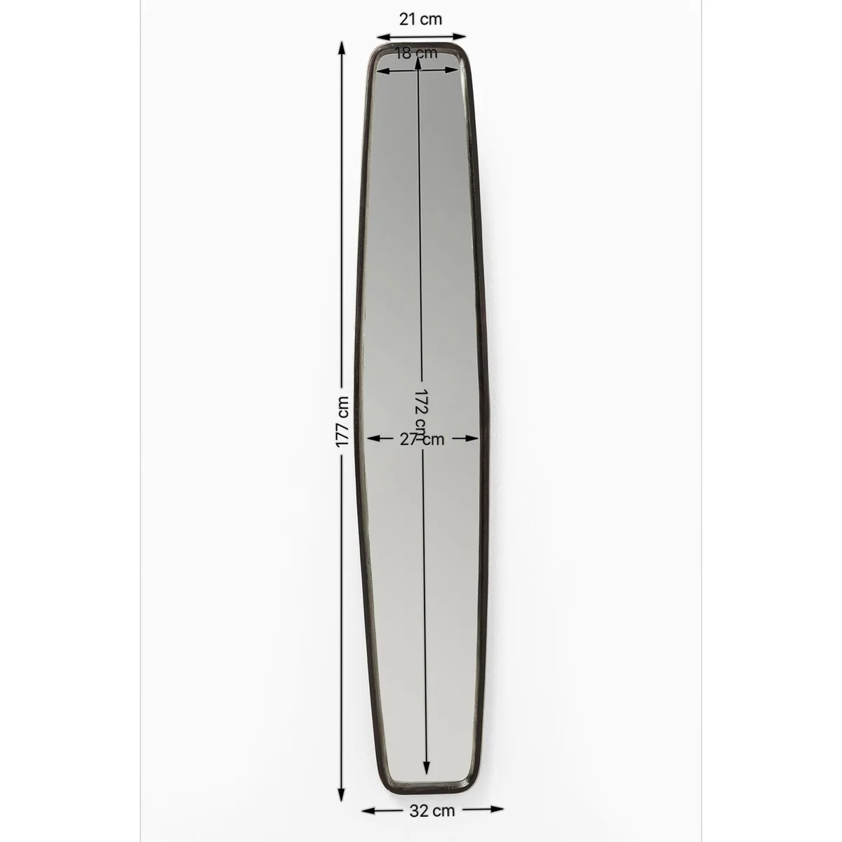 Measuring 177x32 cm with a depth of 5 cm, this mirror is crafted from high-quality mirrored glass. It boasts a unique, elongated design that is perfect for adding depth and dimension to a room. The black color gives it a sophisticated touch, blending seamlessly with any decor.
