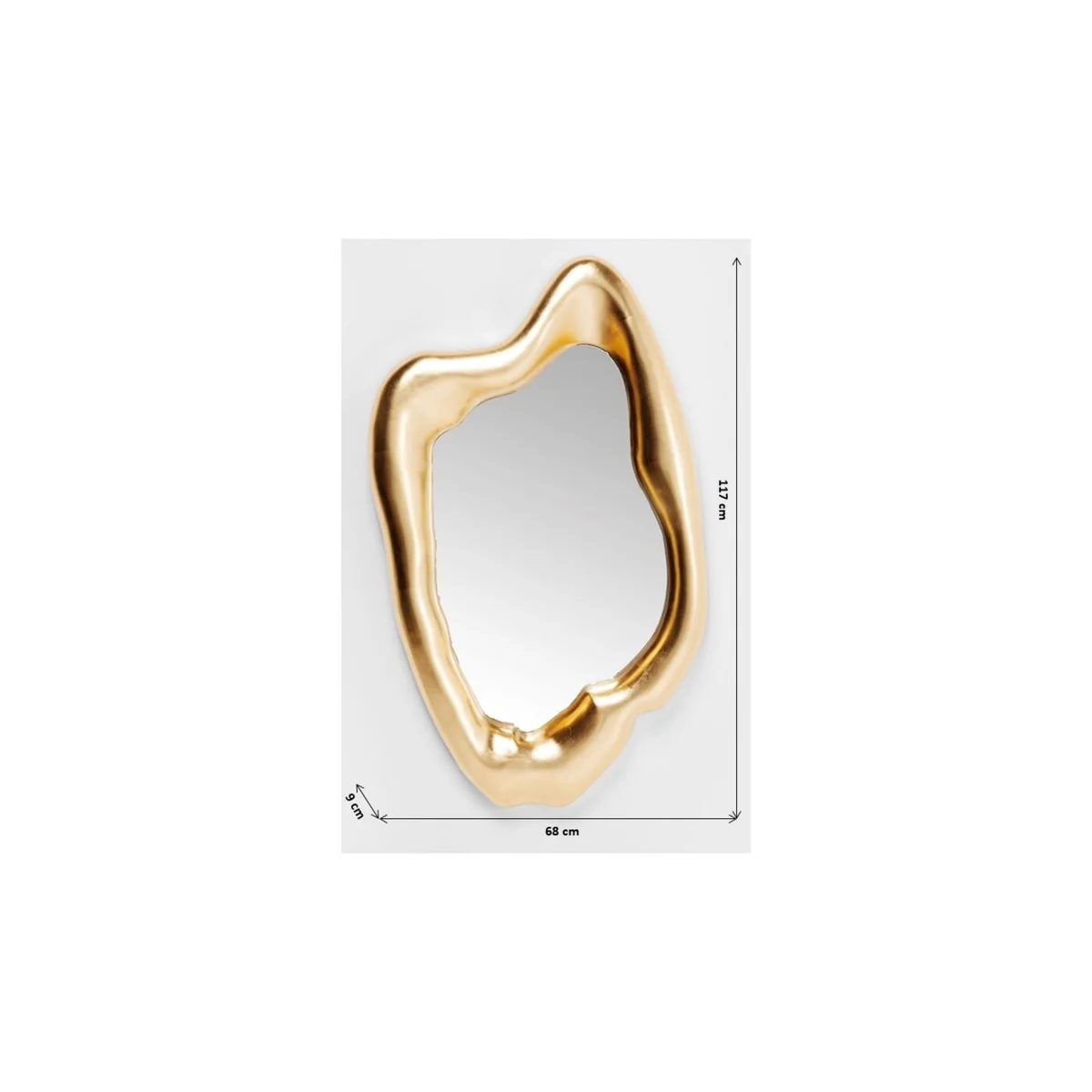 Measuring 117x68 cm with a 9 cm depth, the mirror is framed in a golden hue, giving it a luxurious appeal. The mirror is crafted from high-quality glass, ensuring a clear and bright reflection. The gold frame contrasts beautifully with the glass, creating a captivating hologram effect.