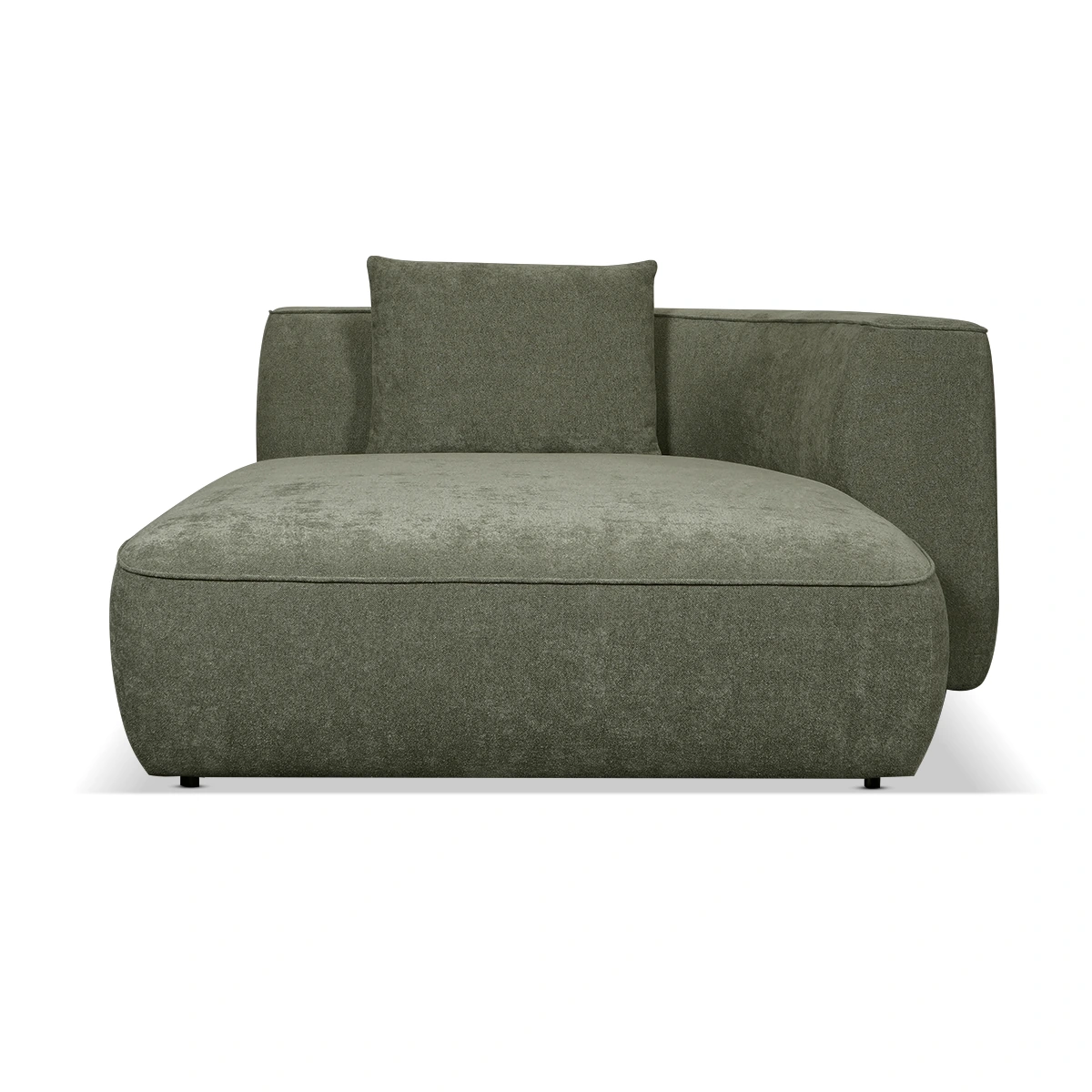 Monza Chaise Longue Right in green is a fabric modular chaise unit designed to add extended comfort and versatility to contemporary sofa configurations. Its elongated structure encourages relaxed lounging while maintaining a cohesive modular design. Crafted with polyester fabric upholstery, it includes supportive comfort foam and a strong frame of beech, spruce wood, and engineered wood. Plastic legs provide stability and durability. Dimensions: L 146 cm, W 167 cm, H 80 cm.