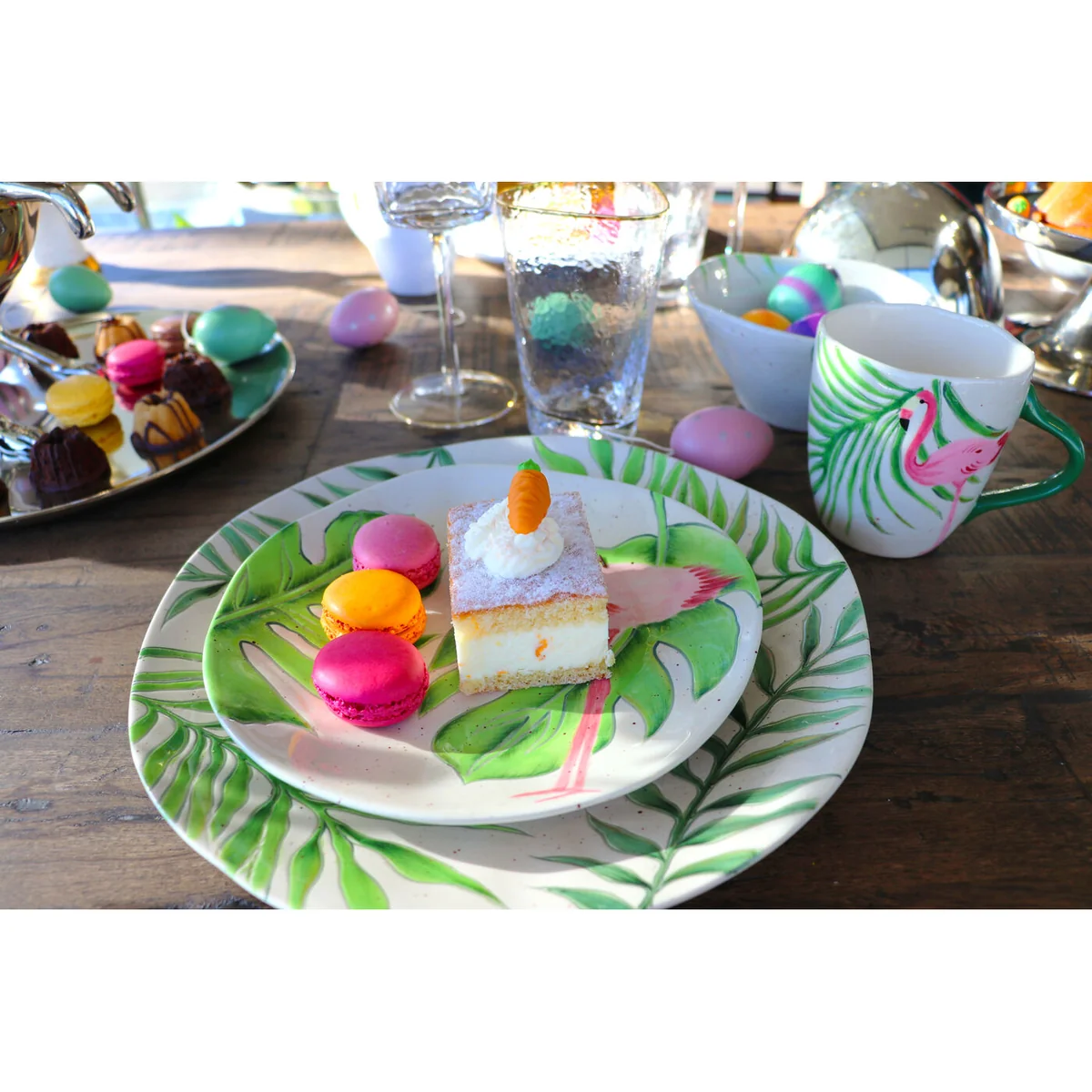 Decoration fans love the Miami style and the jungle look. This range of tableware has everything that makes for exotic flair: tropical leaves against a sand-coloured background and gorgeous pink flamingos. Handcrafted from earthenware, this ceramic tableware brings Caribbean ease to the kitchen, dining room and office.