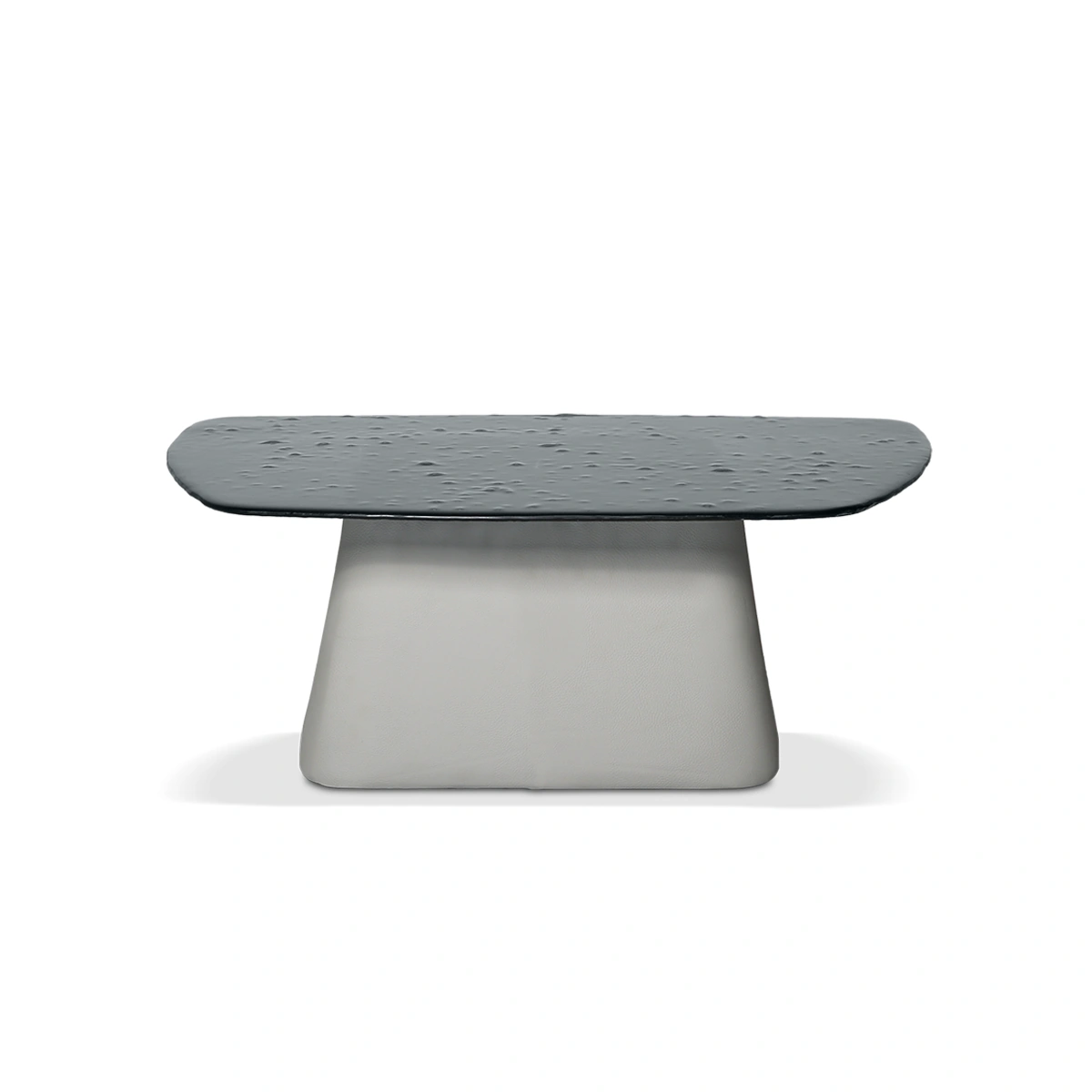 The table features a rounded shape, smooth finish, and generous size, making it ideal for both serving and styling with decor. Crafted from dark grey glass with an eco leather base, it exudes a calm, refined presence. The dimensions of 70cm length, 55cm depth, and 38cm height ensure ample space for your essentials.