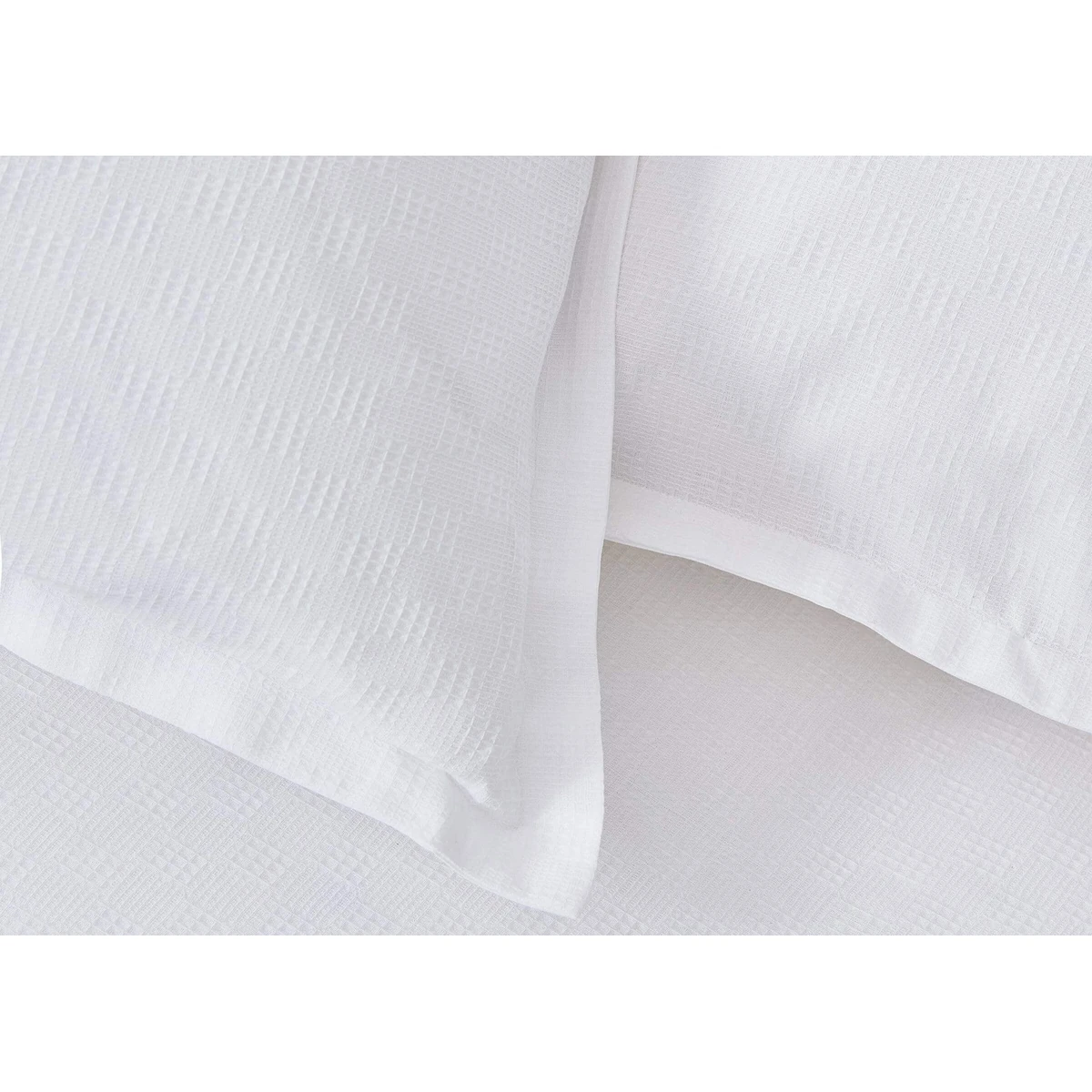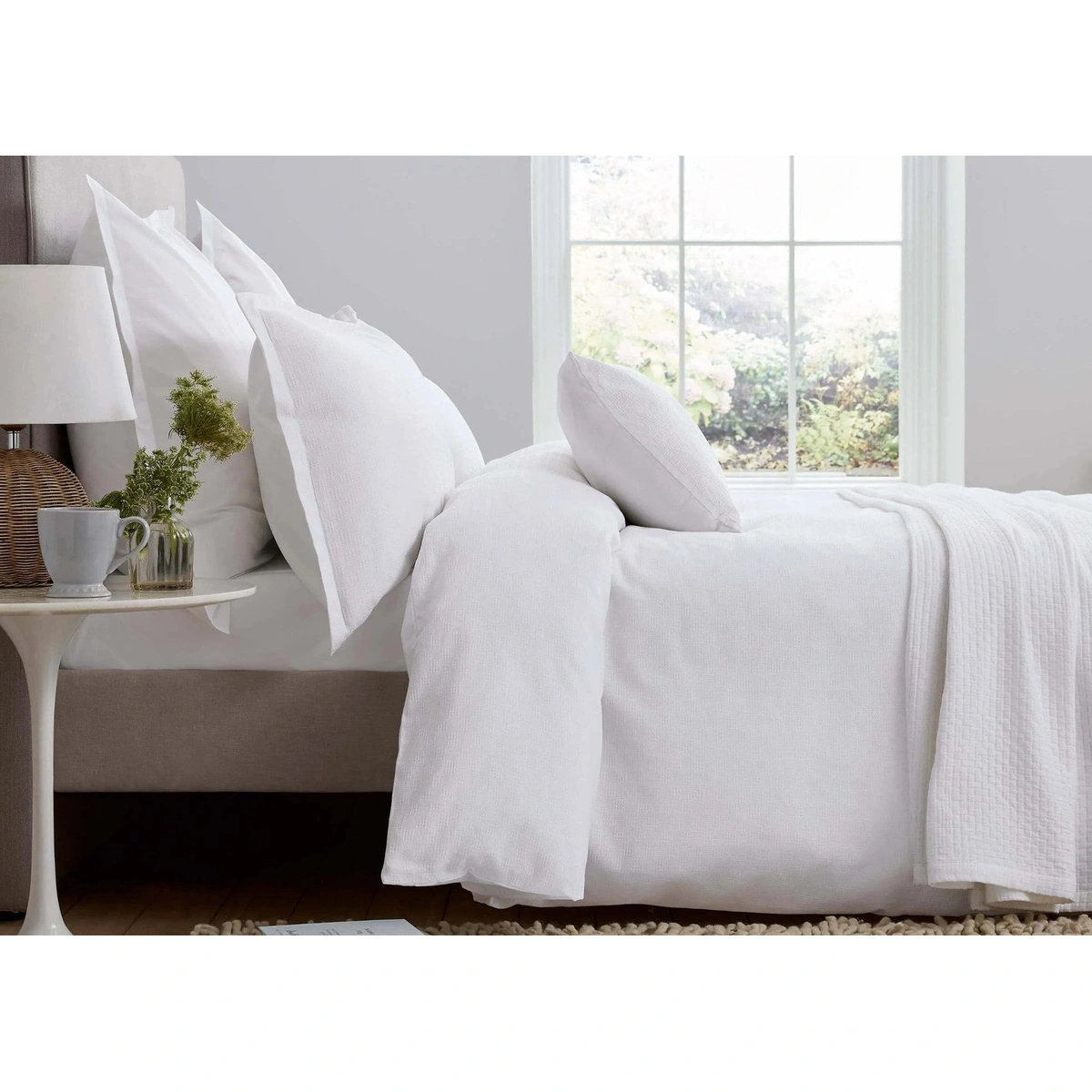 Ari bedding in 100% BCI cotton features a soft geometric waffle texture and smooth 180 thread count cotton percale reverse for breathable comfort and serene sleep.