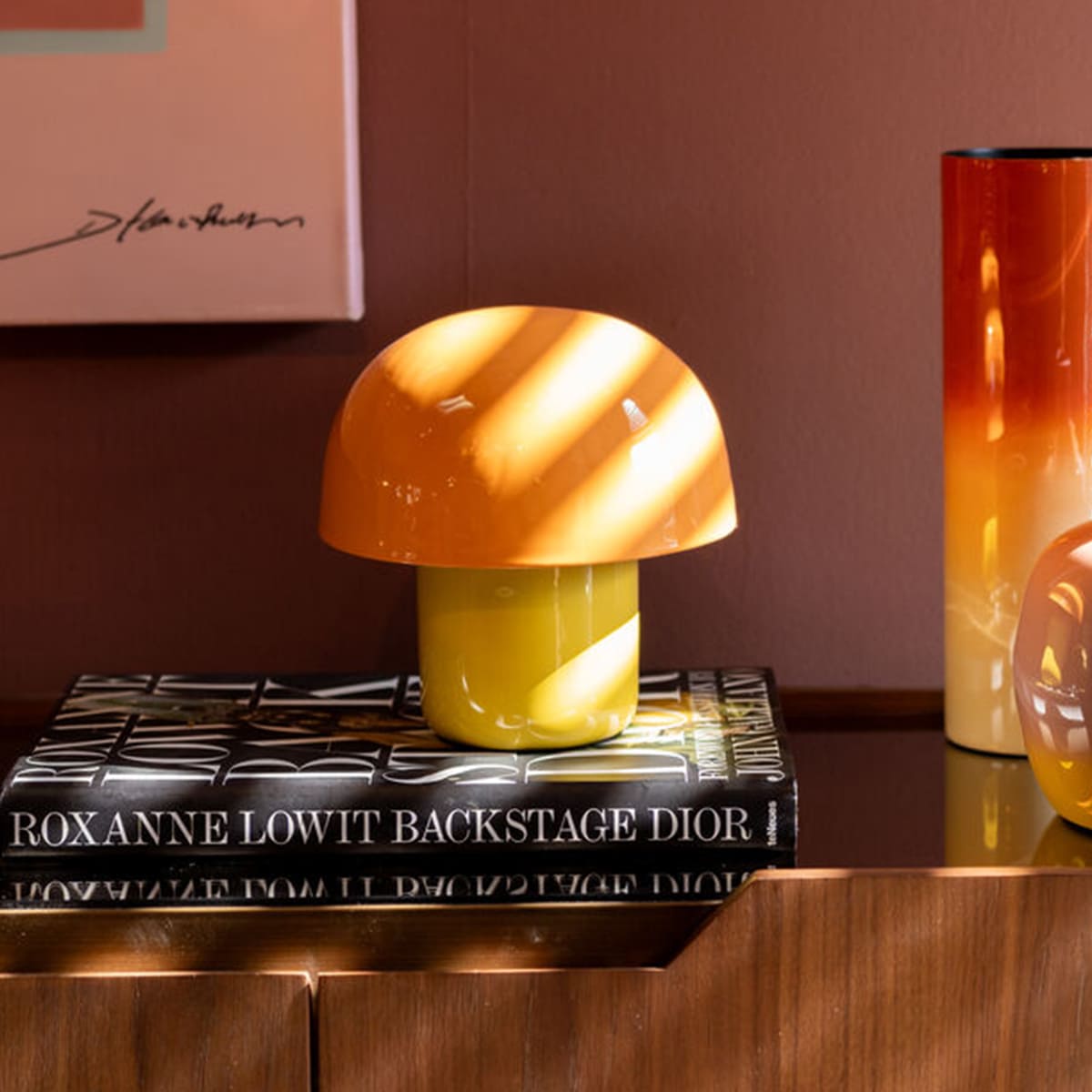 Mushroom Duo Table Lamp in Orange energizes your space with its vibrant tone and rounded design. Perfect for modern interiors, it brings a cheerful ambiance to nightstands, side tables, or workspaces. A statement lamp that brightens your room with both color and light.