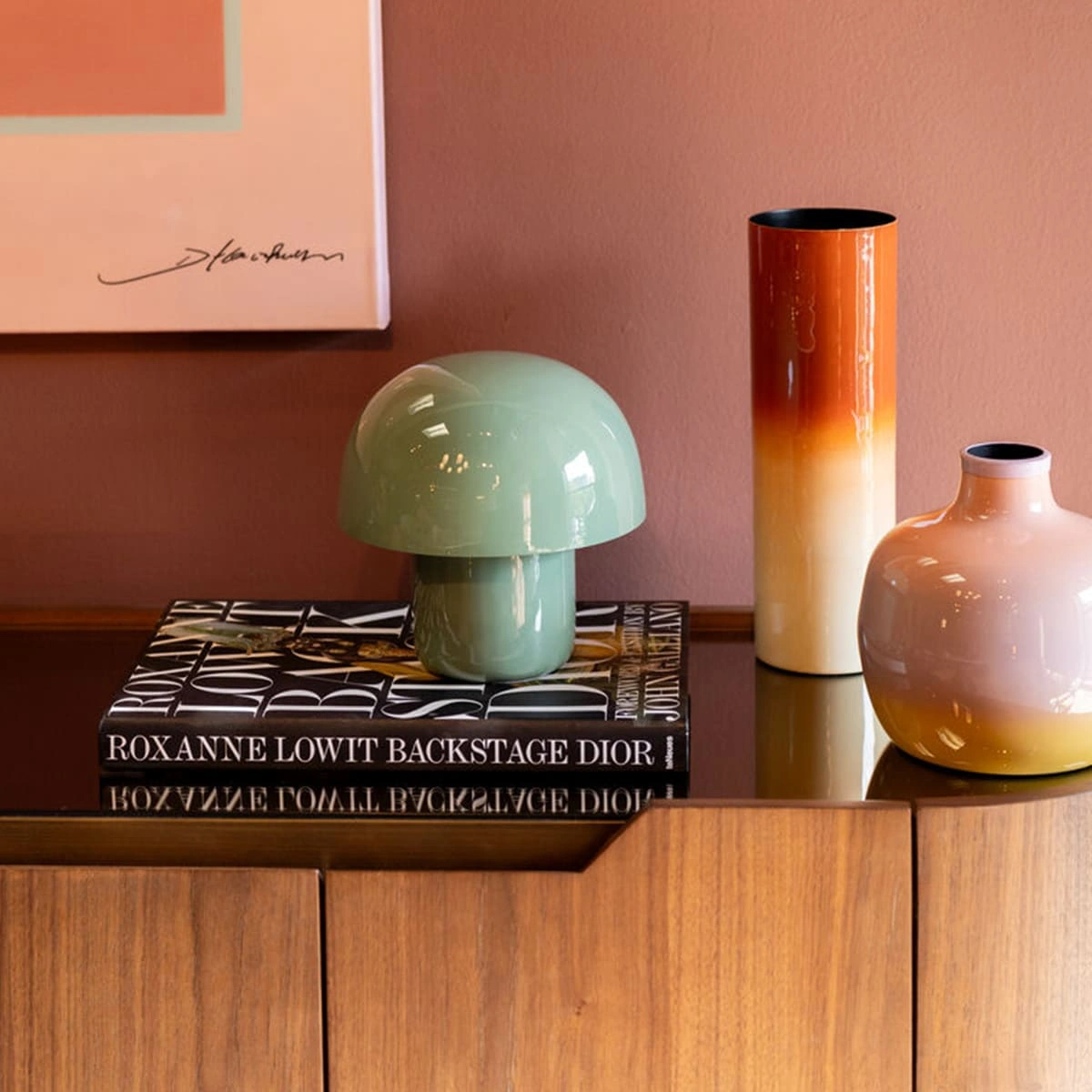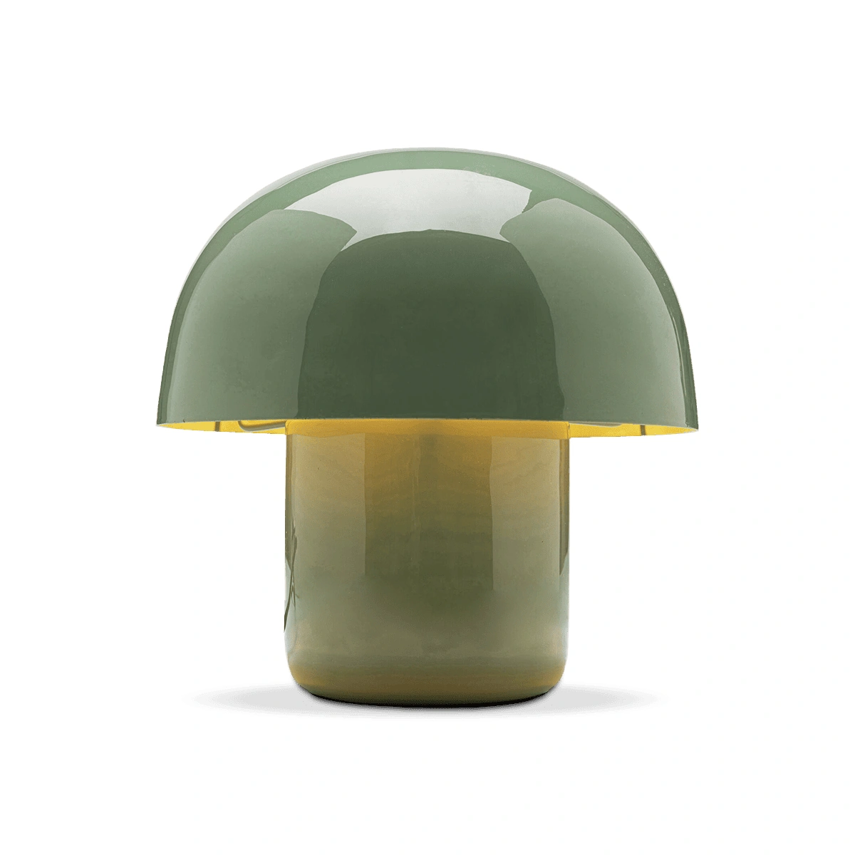 The Mushroom Table Lamp in sage green steel is the perfect companion to create an atmospheric environment in your home.