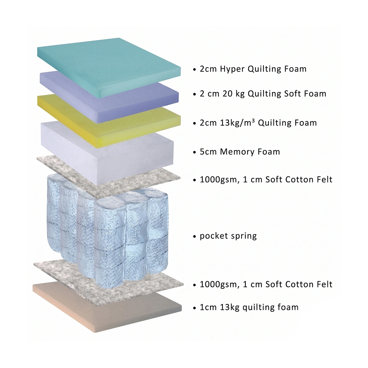 Core: 1.8 mm Pocket Spring System; Layer: Soft Cotton Felt Padding; Support: Memory Foam Layer
