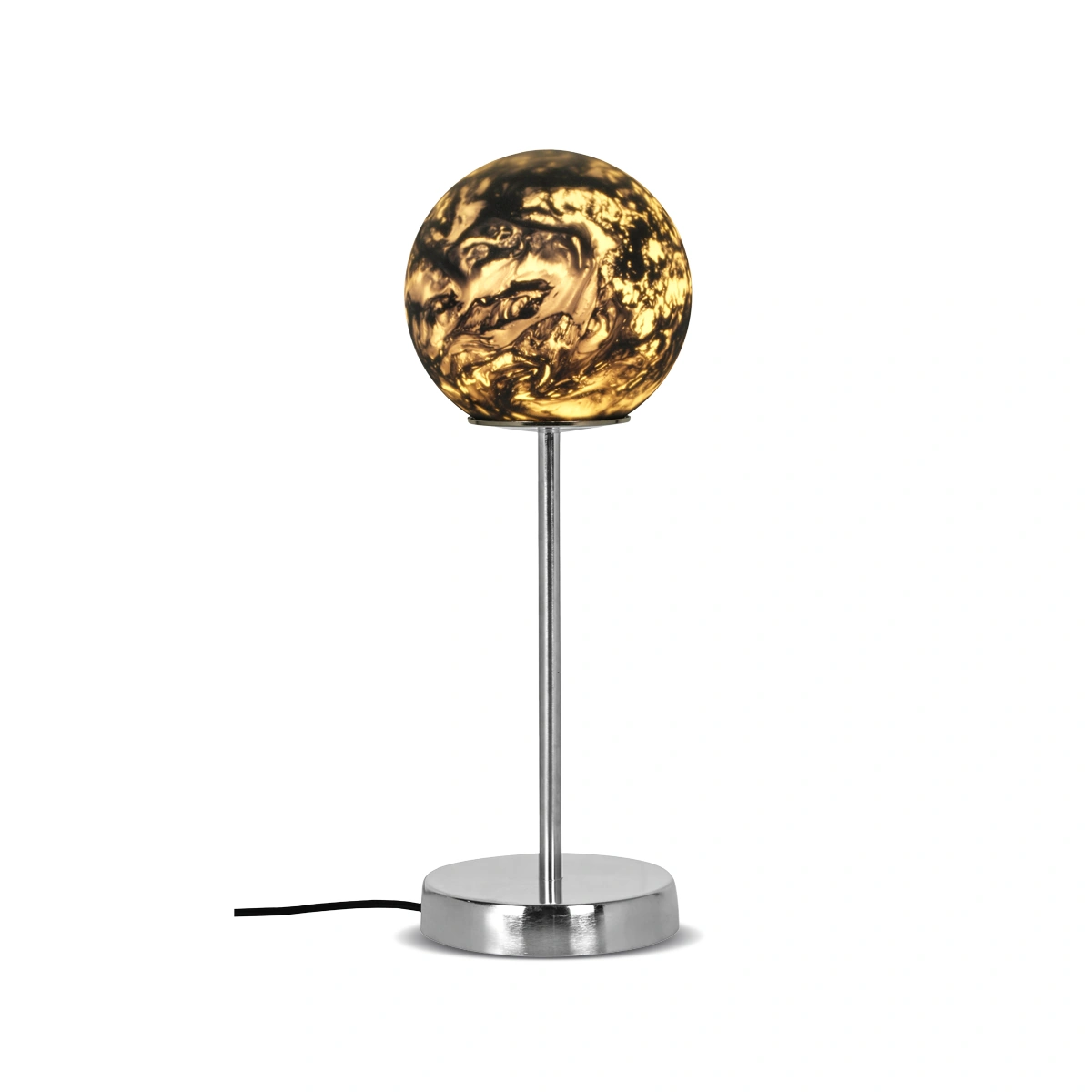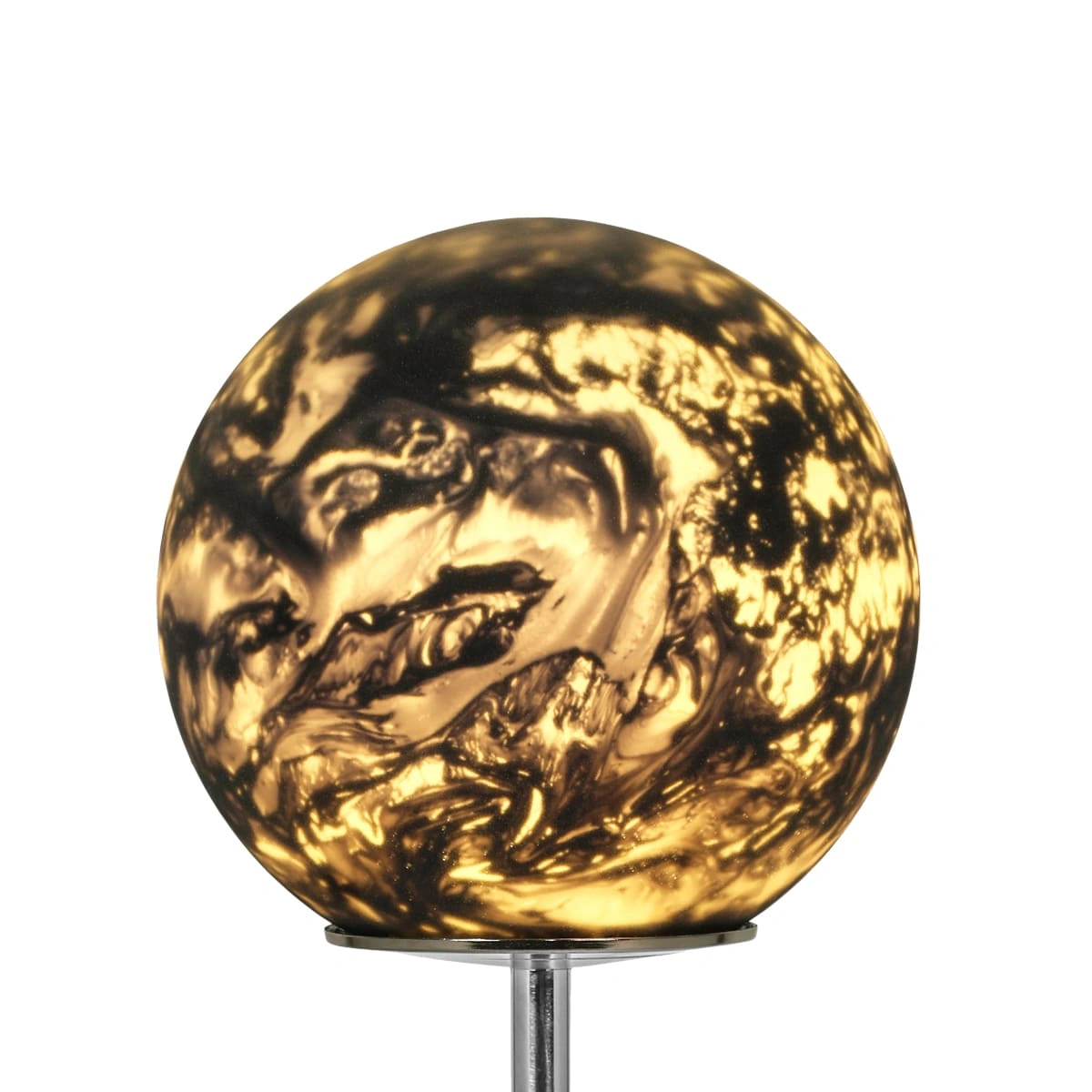 The Noir Single Branch Table Lamp in gold stainless steel and marble-effect glass shade is a stunning addition to any desk or console.