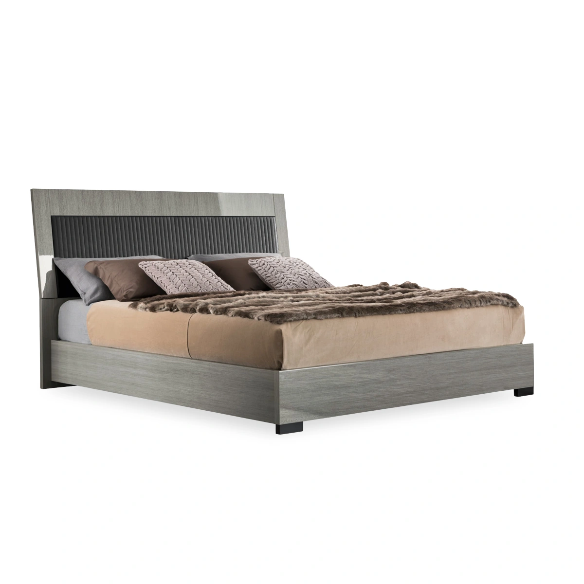 The Novecento King Bed in silverwood exudes luxury with its upholstered frame. Subtle silver tones add depth, creating a tranquil retreat. A perfect centerpiece for modern bedrooms.