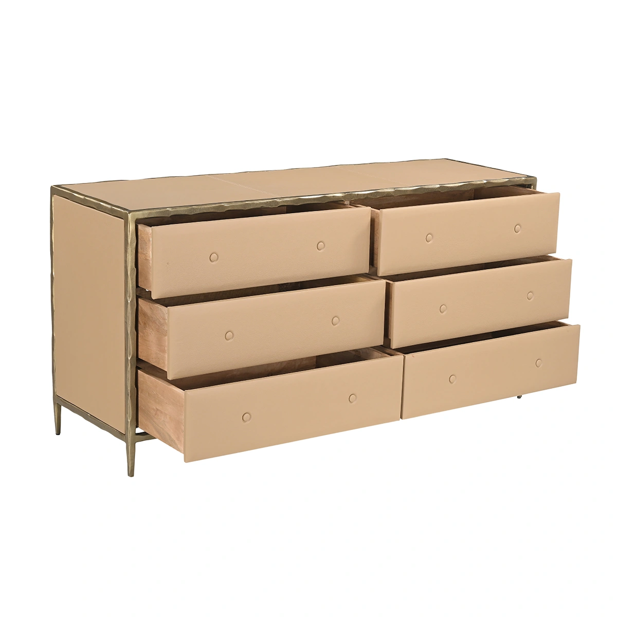 Nyra Six Drawer Dresser – Brass | Leather Wrapped Storage, Spacious Organization & Premium Bedroom Presence