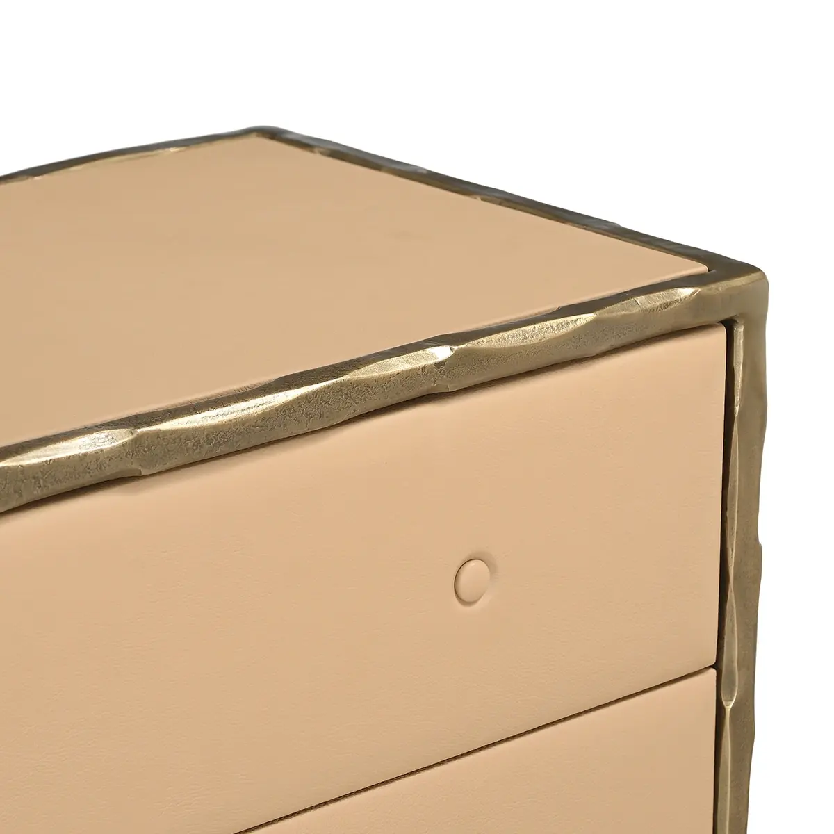The Nyra Six Drawer Dresser in brass brings spacious storage and premium craftsmanship to refined bedroom interiors. Its leather-wrapped exterior and clean structure create a strong visual presence while offering generous organization.
