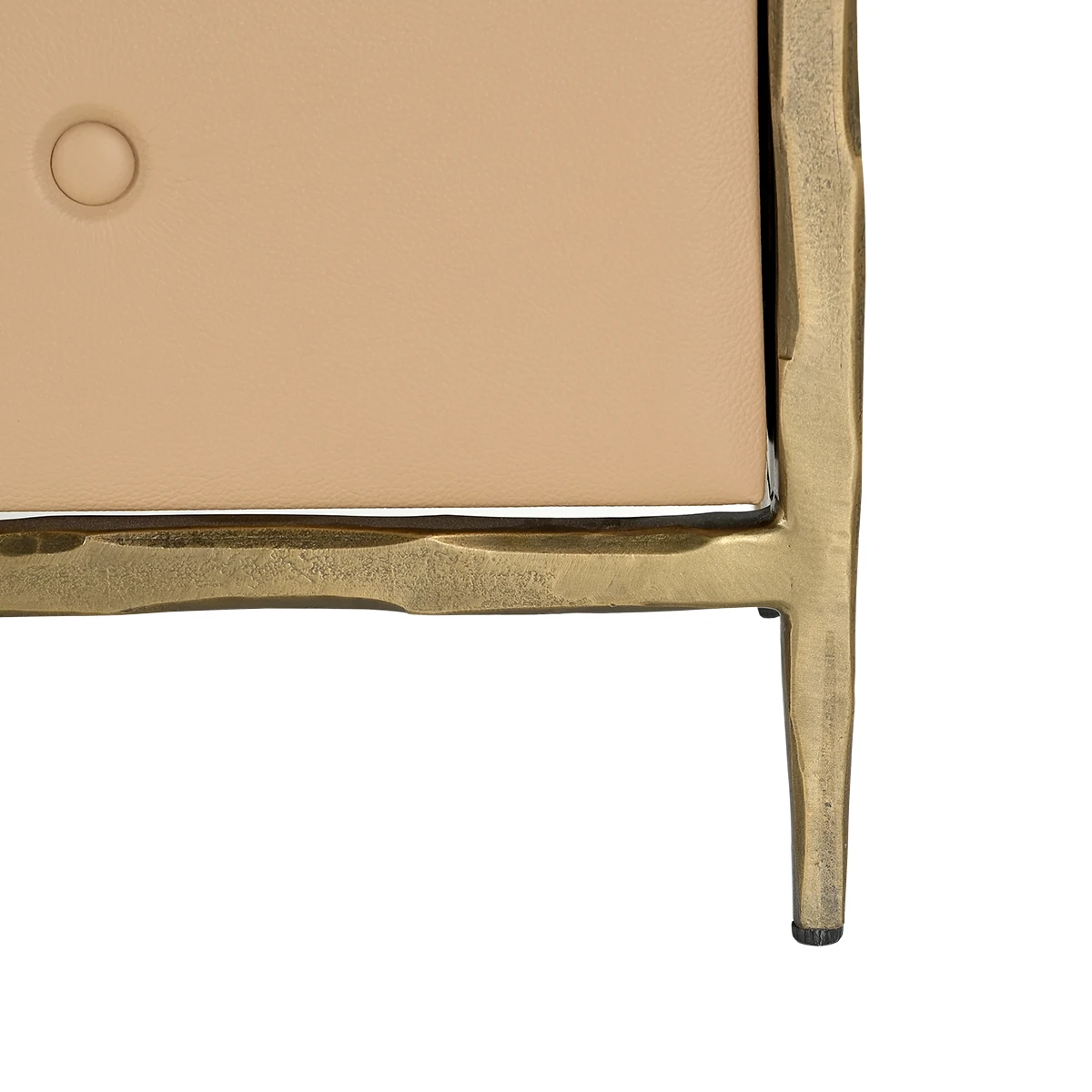 Constructed with a hand-forged metal rod structure, the dresser is upholstered in buff leather and built around a core of plywood, MDF, and mango wood. Six drawers provide ample storage while maintaining a sleek, balanced silhouette.