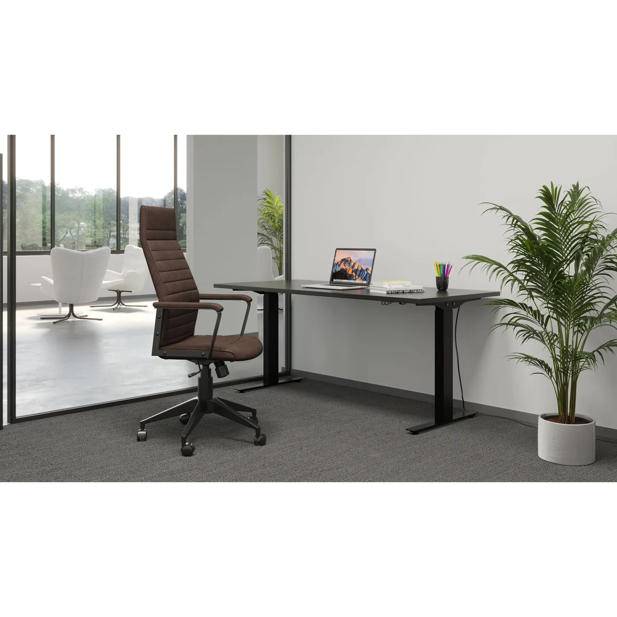 This office chair features a sturdy poplar solid wood frame, untreated for a natural look. The dimensions are 62 cm in length, 59 cm in depth, and with a towering height of 129 cm. The chair's luxurious brown color adds a sophisticated touch to any workspace.