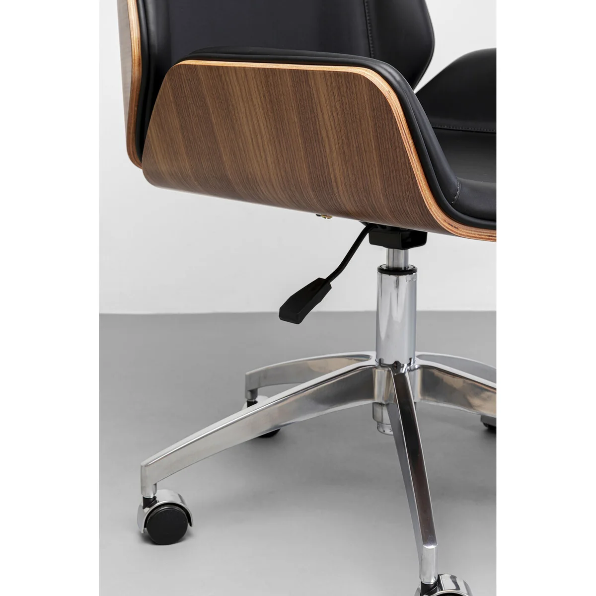 Time will fly by in the office with this office chair. The desk chair can be swivelled and adjusted in height. The black cover with the pleasant foam padding, the silver frame made of powder-coated metal and the walnut wood on the back create the perfect image of a classical, elegant executive chair. The plastic castors are also suitable for carpeted floors. The half-height armrests allow more freedom of movement and, if desired, this office swivel chair can simply be slid under the desk. This modern executive chair promotes healthy working in the office or the study at home.