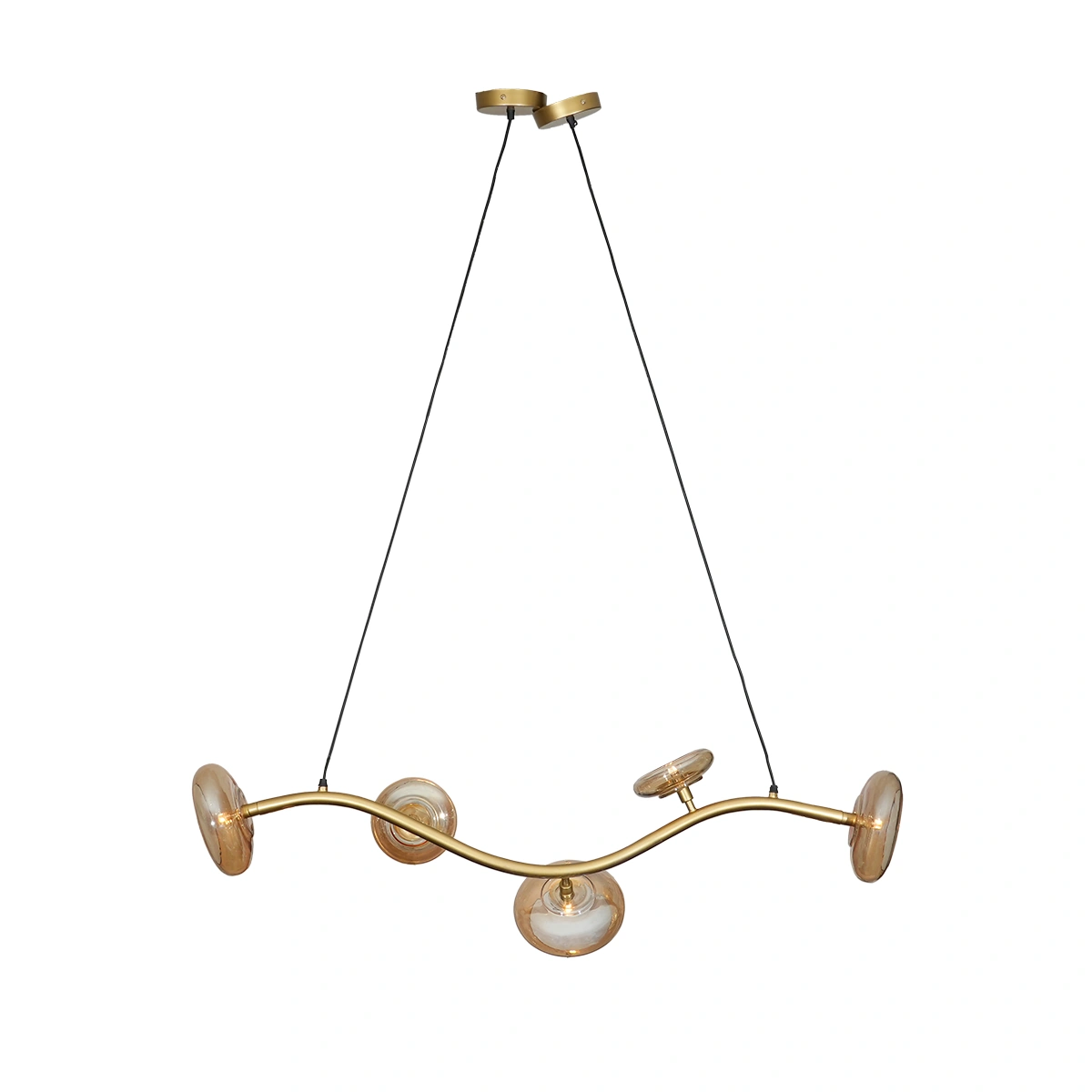Experience the allure of the Oliver Chandelier in gold iron finish. Its wave-like frame and glass disc accents create an inviting ambiance and modern aesthetic.